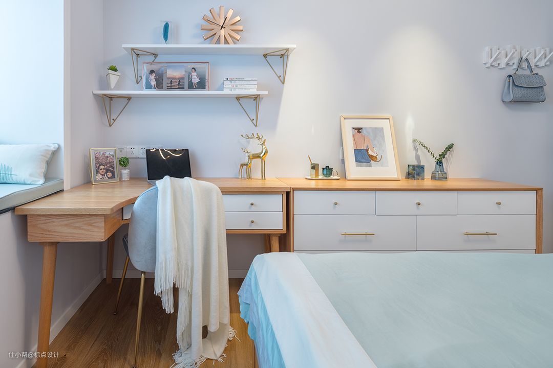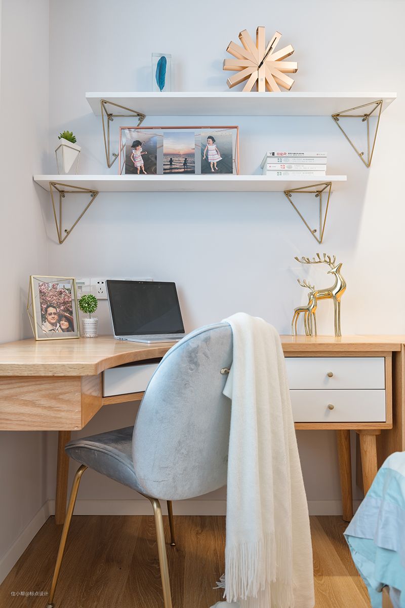 环壁式书桌将实用性利用到最大,卡通画和金色小鹿装饰调剂了白墙底色。在天气晴朗的日子里,坐在窗台消磨时光也是很好的享受。