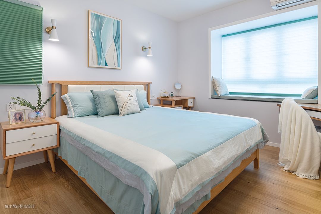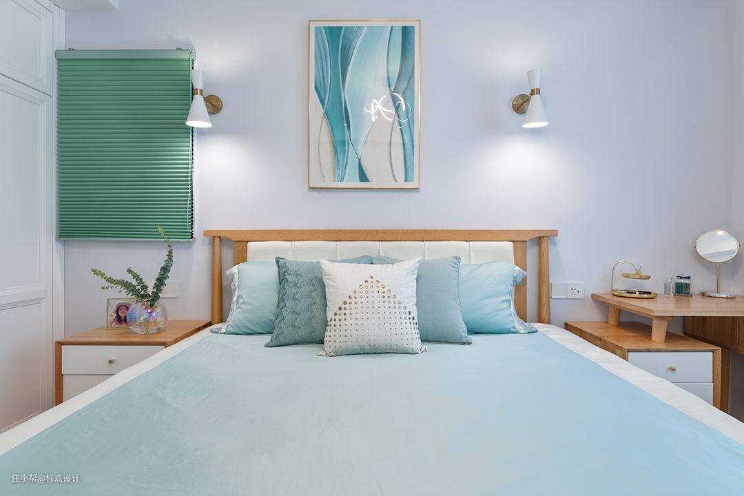 淡蓝色的床品与窗帘、装饰画的颜色融为一体,这一抹纯净的蓝为卧室披上一层温暖缱绻的外衣,实木的肌理,内敛的祖母绿,流露着卧室的静。