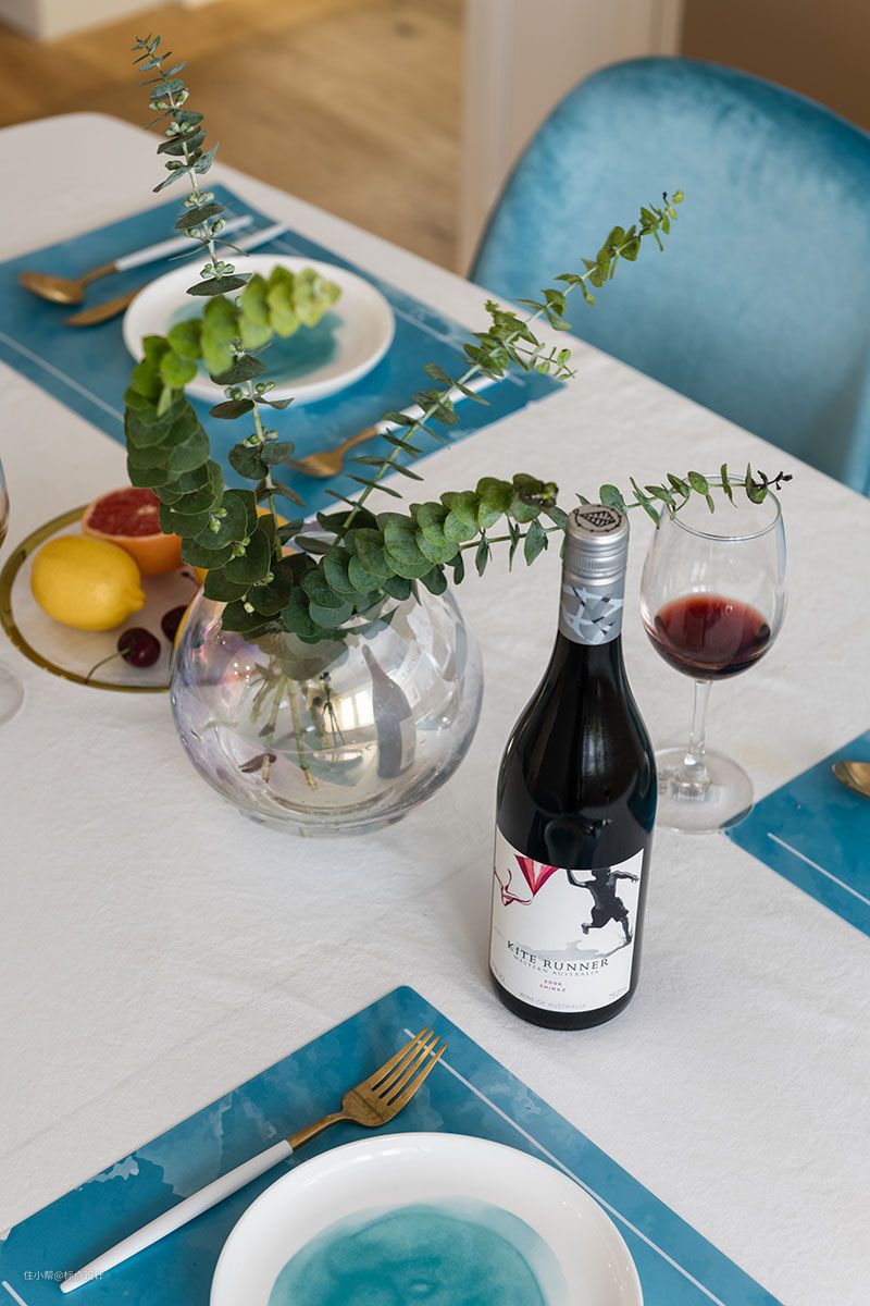 餐厅整体色调以白色为主,加以蓝色的家具和饰品来点缀空间色彩。