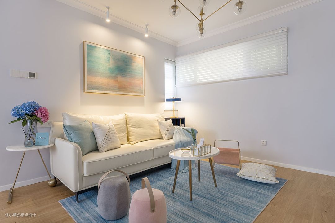 纯白的百叶窗帘巧妙地过滤了自然光线,使空间更加通透明亮。工艺感十足的吊灯,温馨的纯色布艺沙发,小小的客厅,幸福的温度脉脉而生。