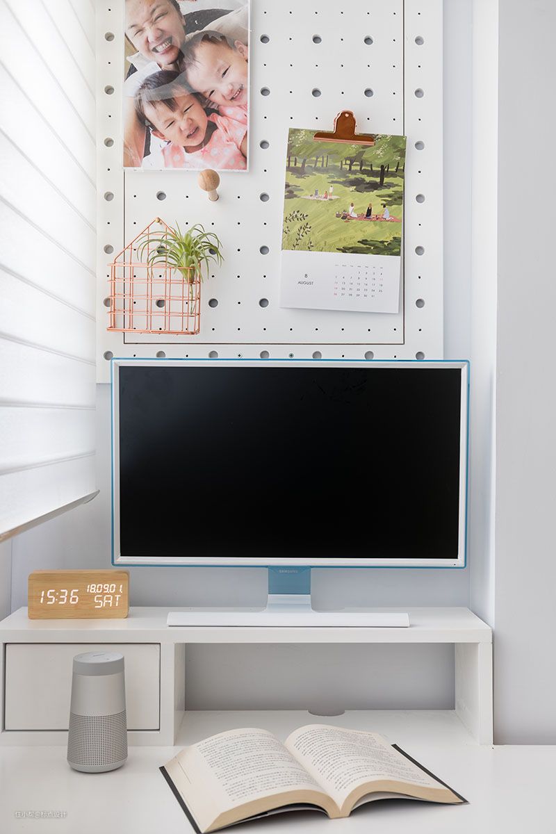 这块区域是原来的阳台空间,现在变成了女主人的办公区餐厅,与餐厅相邻互不干扰,大面积白色带来明澈柔和的感受。书柜充分发挥收纳实用功能,填满主人与双胞胎女儿的幸福生活轨迹。