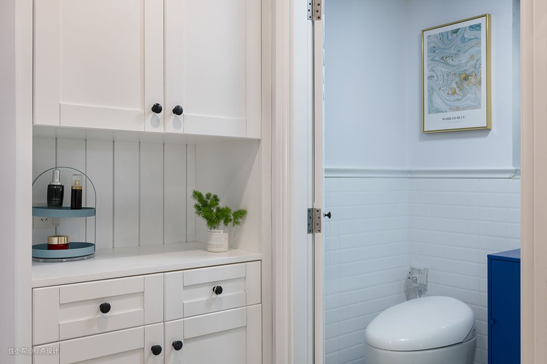 卫生间做了干湿分离,淋浴房墙面用了淡蓝色的玻璃砖清莹剔透,给主人提供了一个令人舒适愉悦的洗浴空间。浴室柜分层分区收纳,方便日常瓶瓶罐罐的拿取。