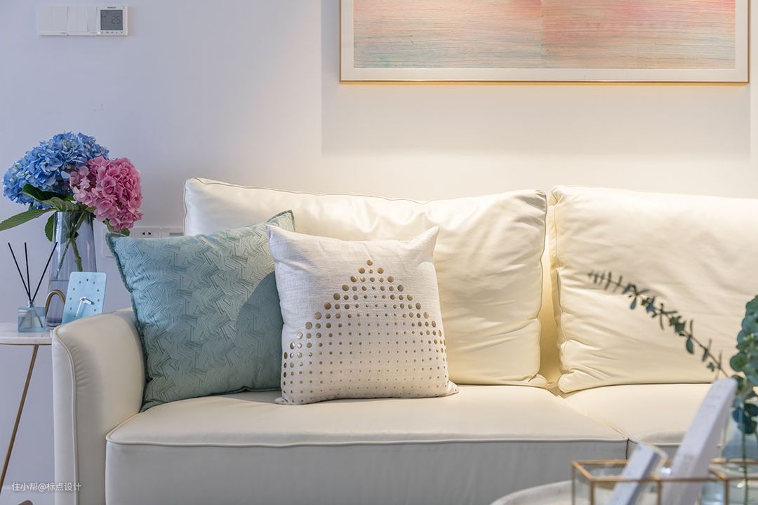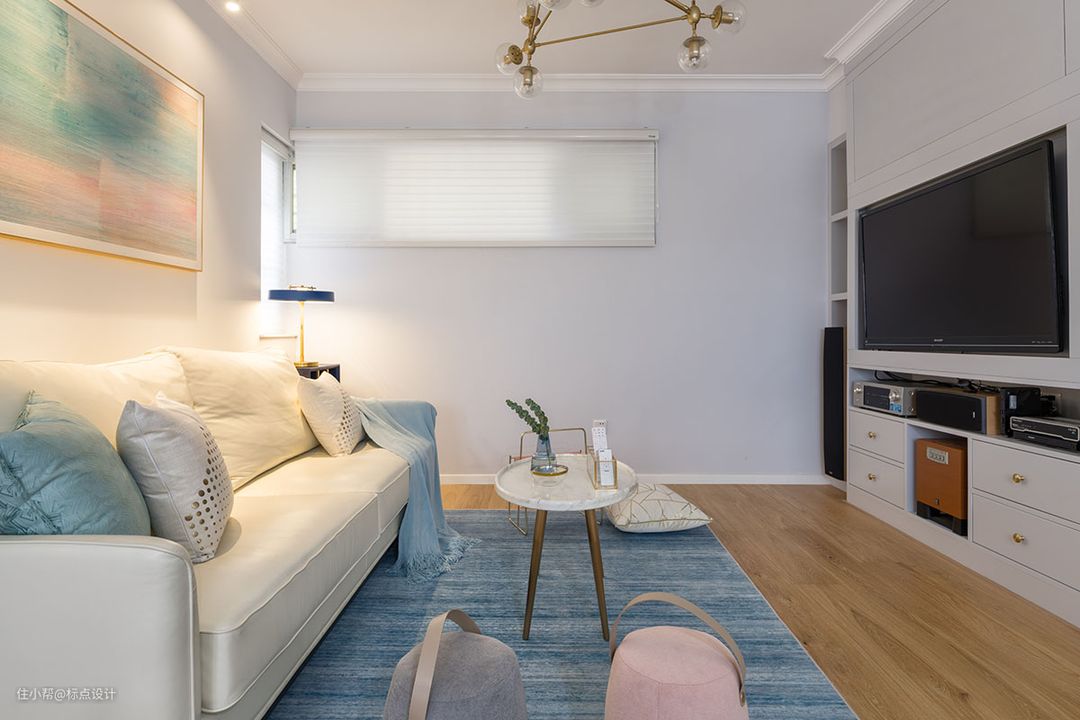 客厅主题色调以蓝色为主,在搭配白色和粉色的家具装饰,让整个空间自然温馨。