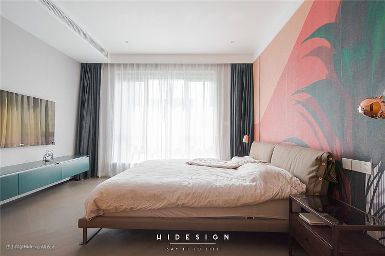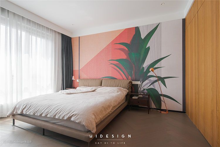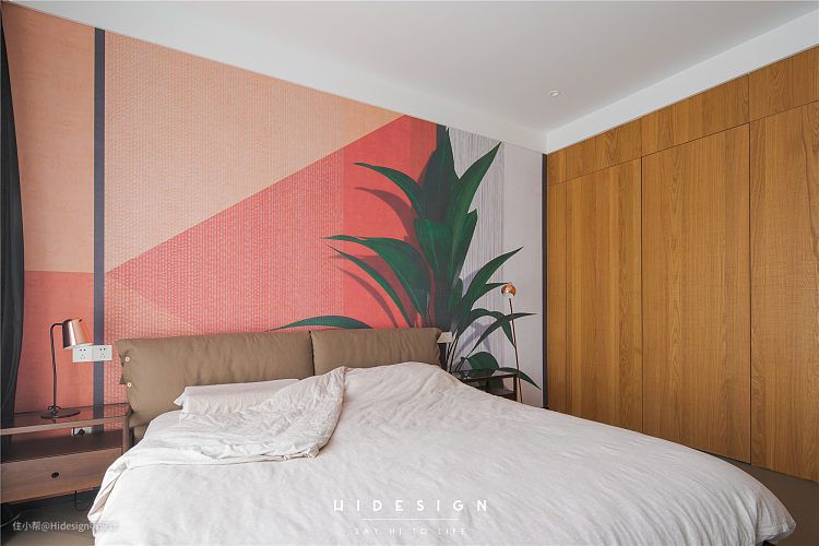 本案大部分空间都是选用了简单干净的纯色饰面,但是在主卧这个区域,选用了稍微丰富一点的颜色搭配,因为此处的阳光实在是非常棒,阳光洒进来的感觉相当的舒适,配合这个背景,有那么一点在热带度假的感觉。