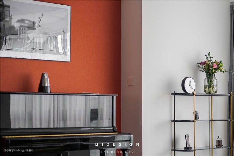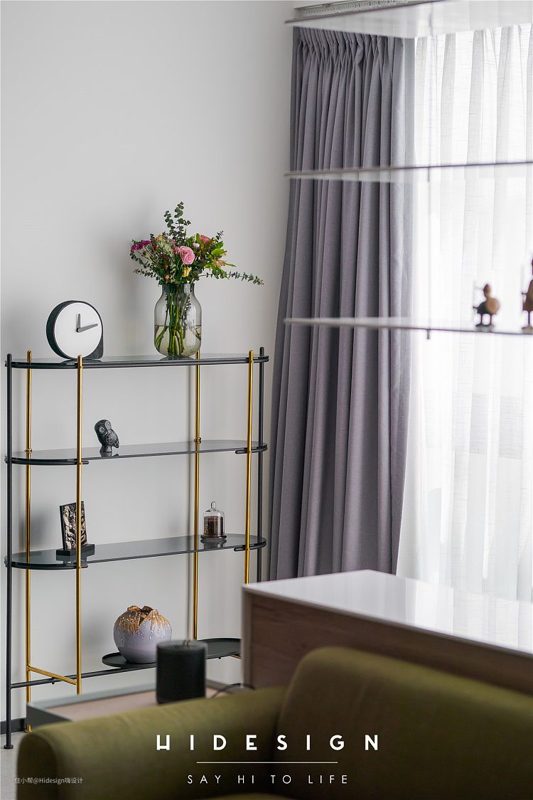 在原本阳台的位置,有一根支柱属于承重结构需要保留,因此利用这根柱子,做了悬空的装饰置物架,避免了柱子比较突兀的不平衡感。层板在设计和施工的过程中进行了反复的测量和定位,选用了高强度的五金件,对安装的工艺要求相当高。