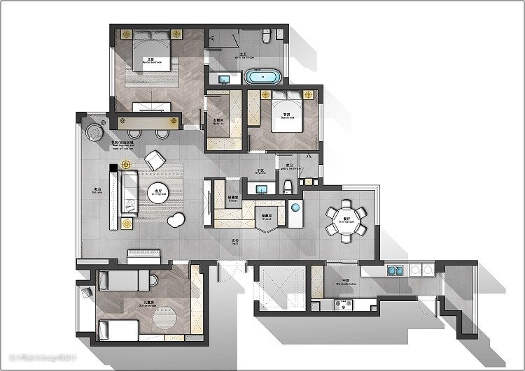 卫生间区域因为衣帽间的外移,拓展出了足够的室内空间,干区+浴缸+淋浴的结构,做到了另外一种的三分离。