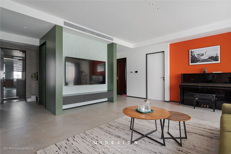 左侧的电视机柜和背景墙因为该处原本没有墙体,完全是依靠板材构建起来的,对施工工艺和构件要求较高,在各方的通力协作下,成品完美的实现了功能需求。