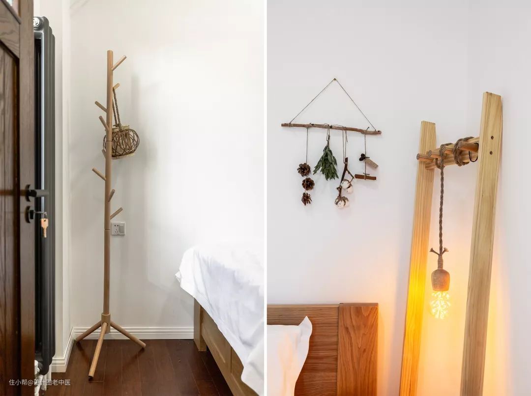 床头的暖色小灯、粗糙的麻绳以及松果树枝装饰也给这个极简风格的次卧增添了质朴自然的气质。