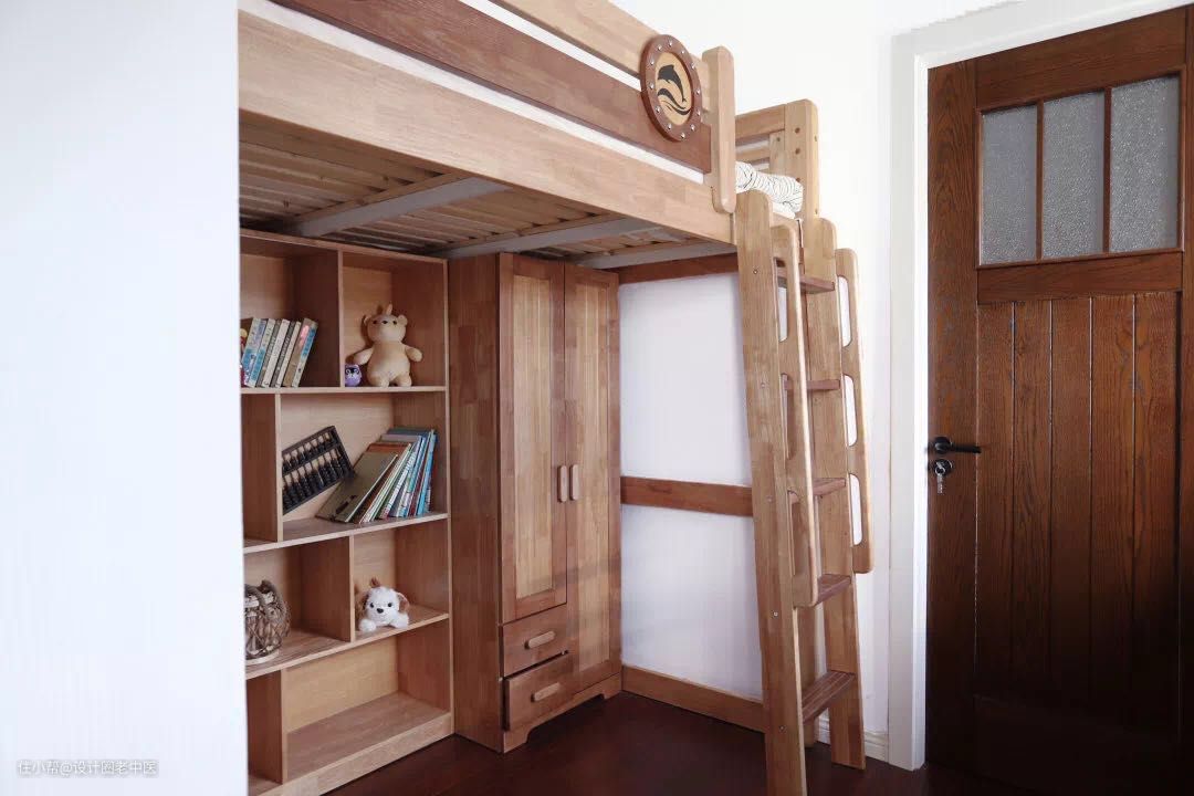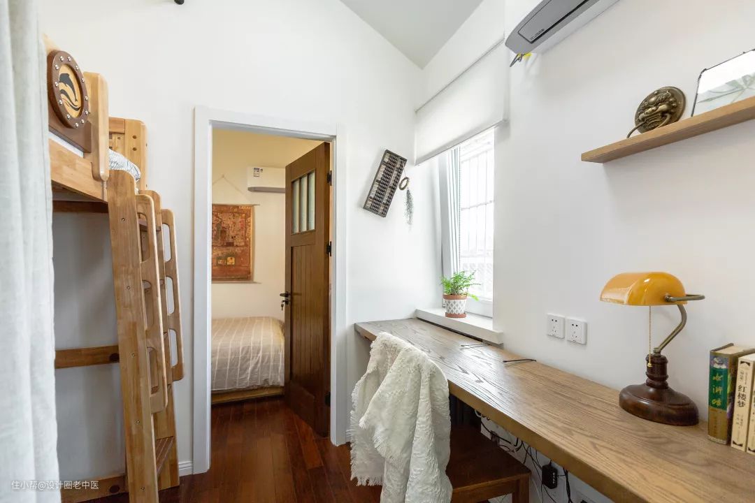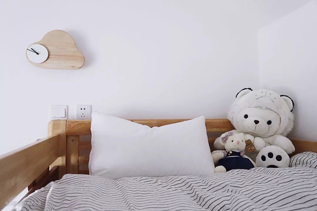 儿童房是原主卧的一部分,使用上床下桌的设计,让空间同时具备休息和收纳的功能,非常实用。加一个帘子、一盏暖黄色的云朵壁灯,就是孩子们最私密有趣的“冒险乐园”。