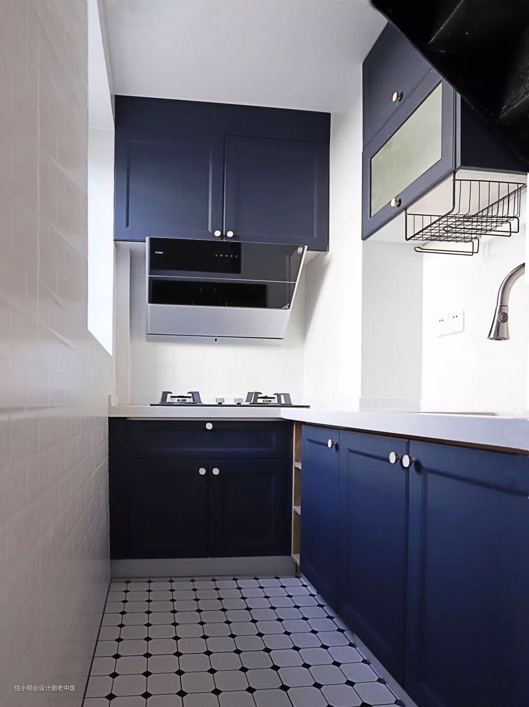 前面我说到卫生间和厨房之间的墙用了异形的处理,把厨房台面使用不方便的位置让了出了来放置壁挂马桶的水箱,水箱上方还可以放置一个壁挂的即热热水器,而且最重要的有了独立可以淋浴的空间。