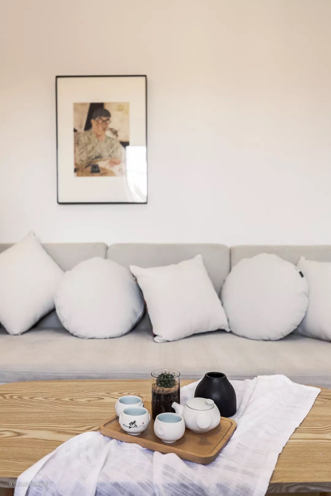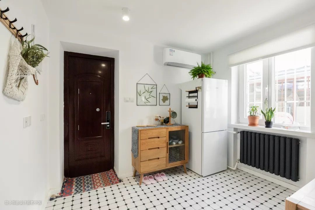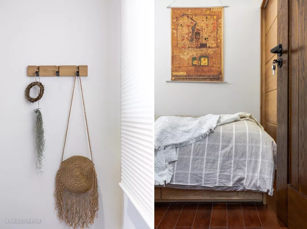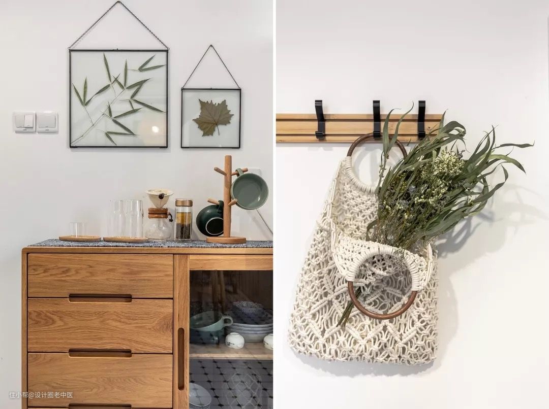 进门墙面上原木挂钩作为玄关收纳,可以随手悬挂进出门需要的衣帽,加上设计师自己DIY的挂画,一个兼具功能和颜值的玄关就诞生了。进门的玄关柜上除了可以随手放置一些零碎小物,还作为餐厅的储物收纳,平时的玻璃杯和盘子都收在这里,用起来非常方便。
