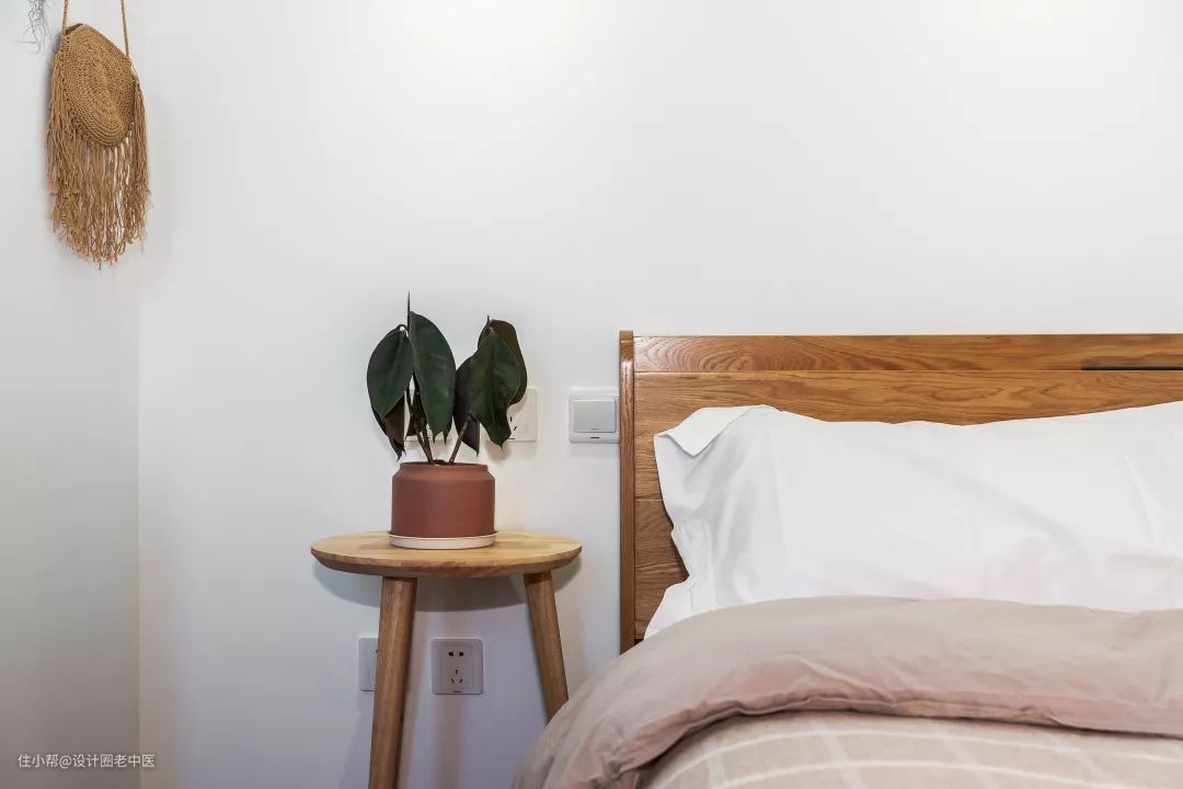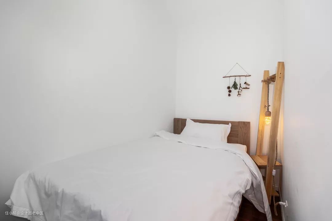 床头的暖色小灯、粗糙的麻绳以及松果树枝装饰也给这个极简风格的次卧增添了质朴自然的气质。
