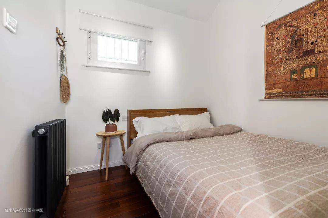 卧室位于二层的尽头,是个不规则的小空间。原本卧室的基础条件很一般,除了不规则的形态外,因为是胡同老房子,所以窗户也非常小,采光情况不好。我们延续了能让房子看上去更大更明亮的“四白落地法”,在一定程度上弥补了采光问题。