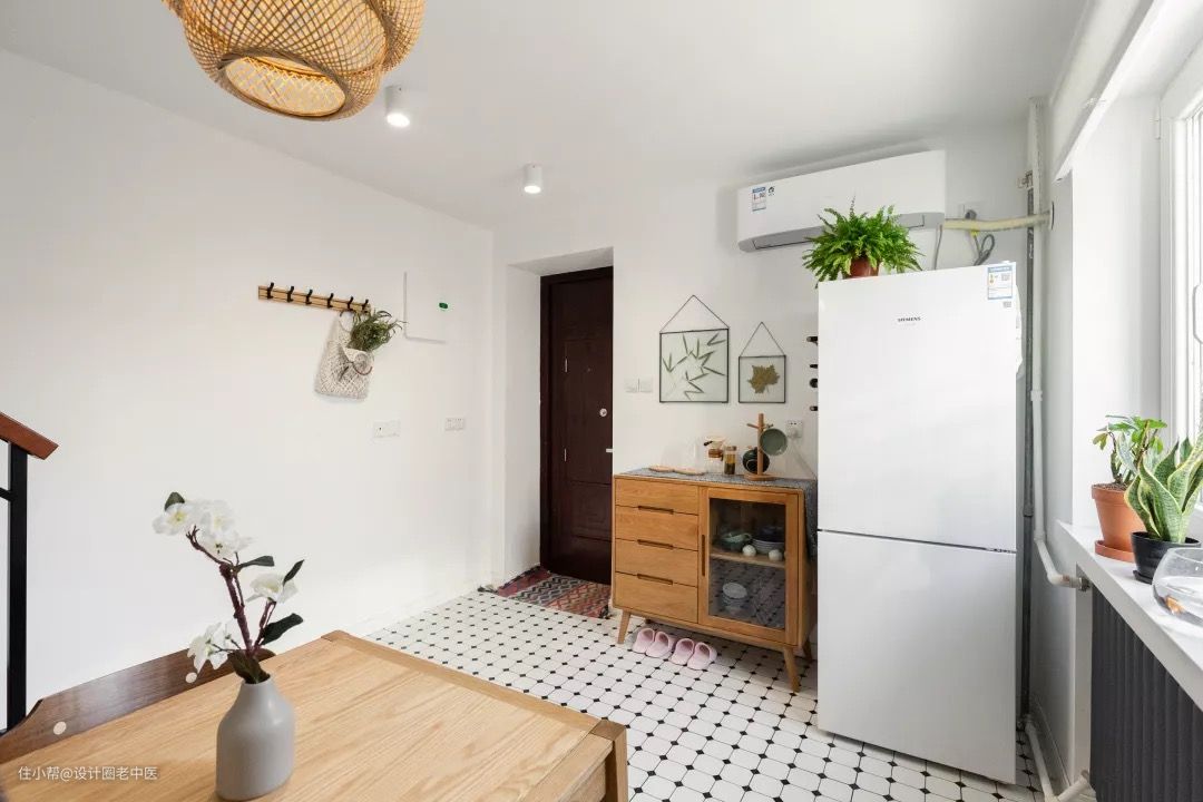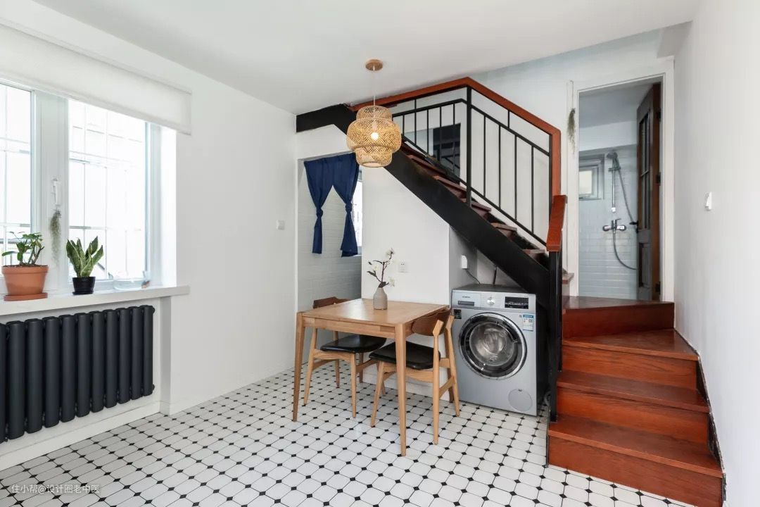 将原有的楼梯下的墙打掉,楼梯下也放置了洗衣机和储物篮榨干了最后一点空间,白色的墙漆配上白色的地砖让屋里瞬间明亮了许多。