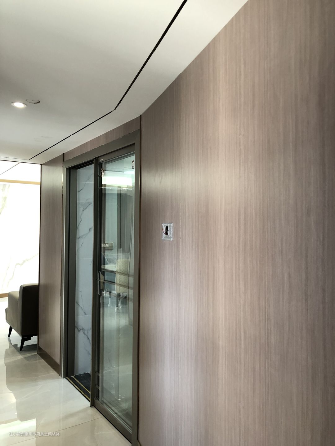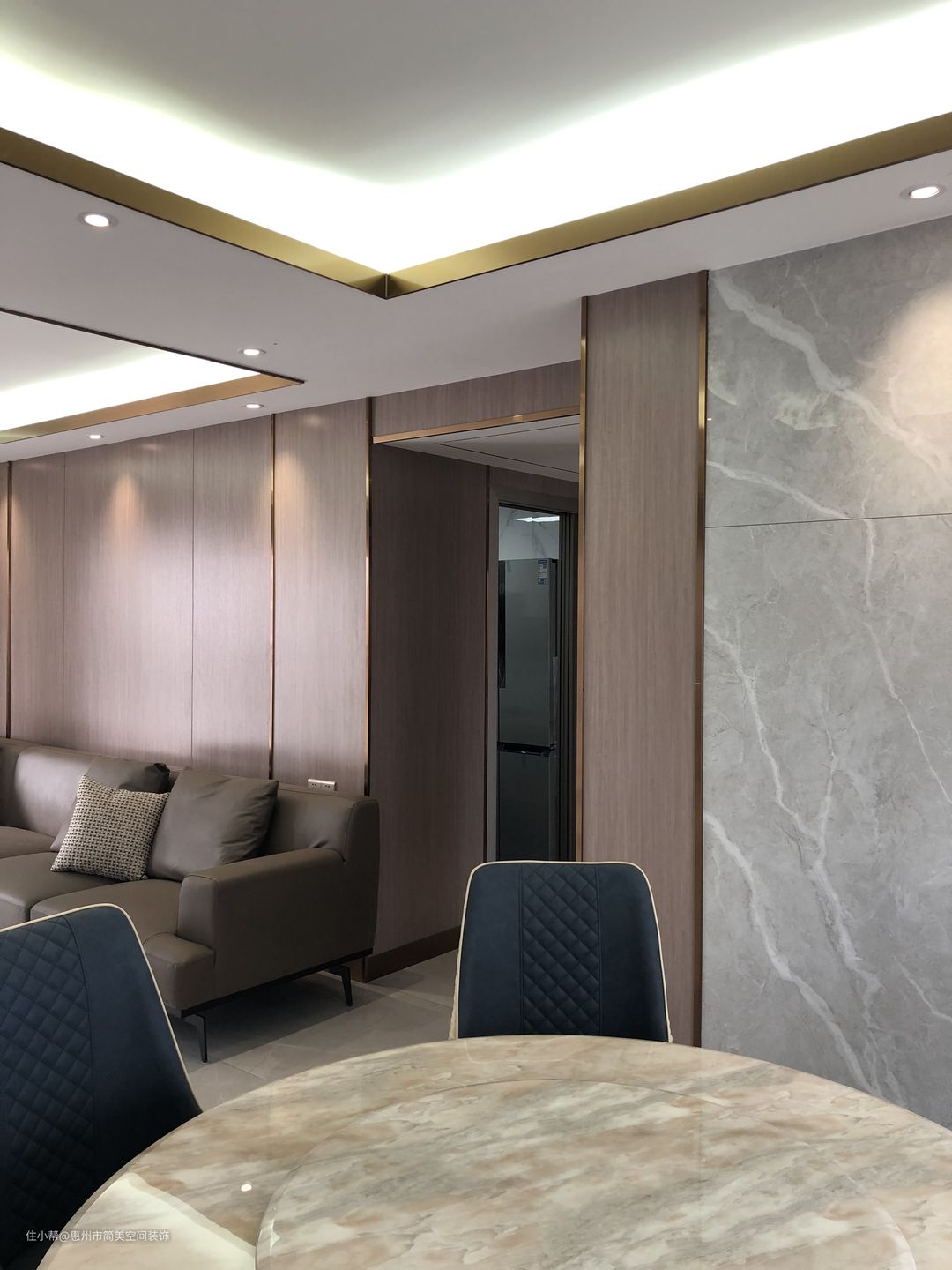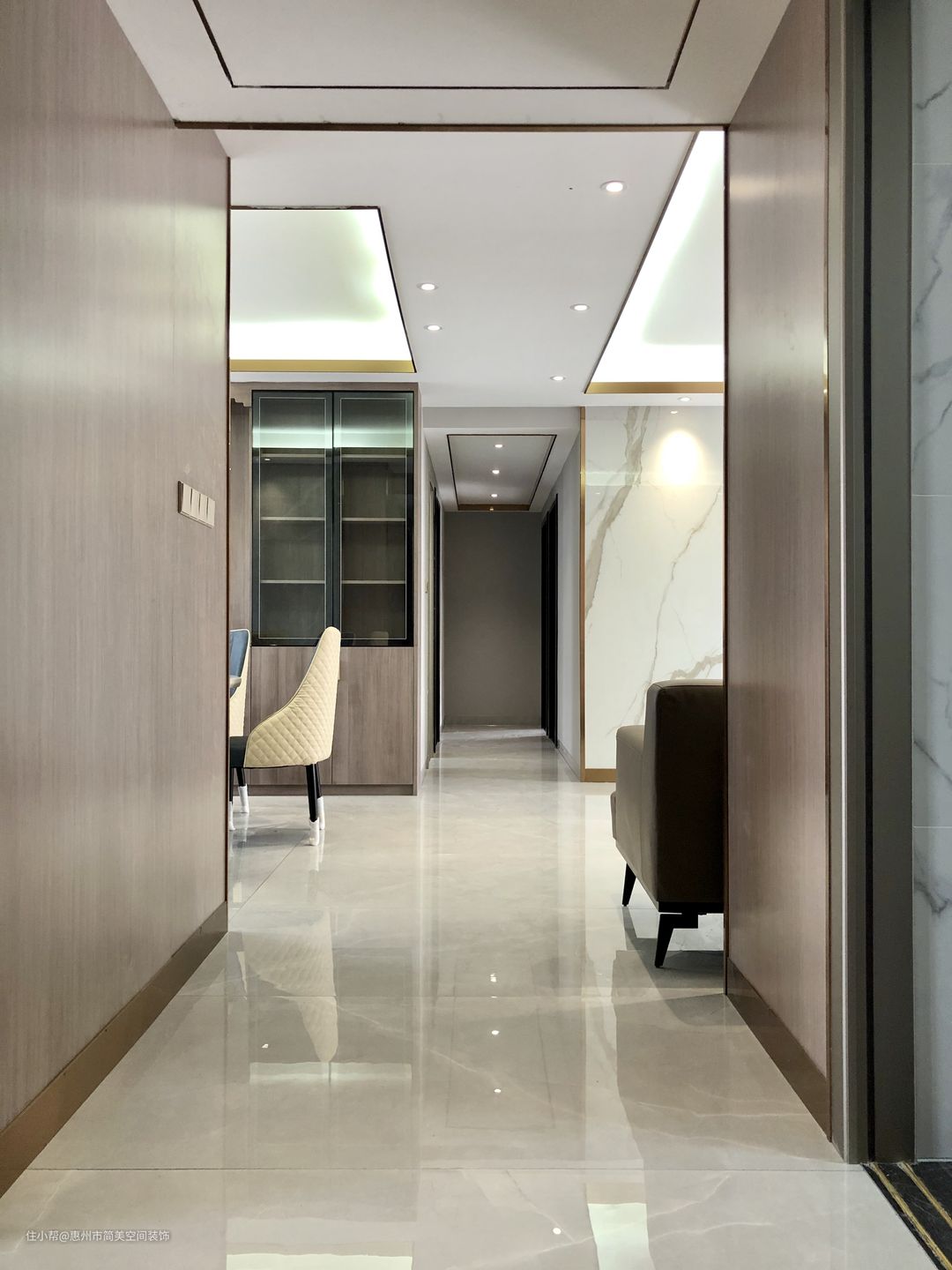 业主需求是简洁,大气的现代风格,家里有老人,一个男孩,一个女孩。希望整体氛围能温馨点。又不希望过于复杂。业主喜欢金属线条的奢华感,又担心金属条过于多了的话,老人可能不太适应。所以在入户区域用了大色块的暖灰色的木质护墙板提升家居的温馨感。在电视背景的处理上用爵士白大理石上的纹理和护墙板的平静形成互补,白色颜色和整体灰色调形成对比,突出背景。提升整个空间的亮点。过道采用灰色硅藻泥的肌理质感来提升材质对比。增加家居温馨感。