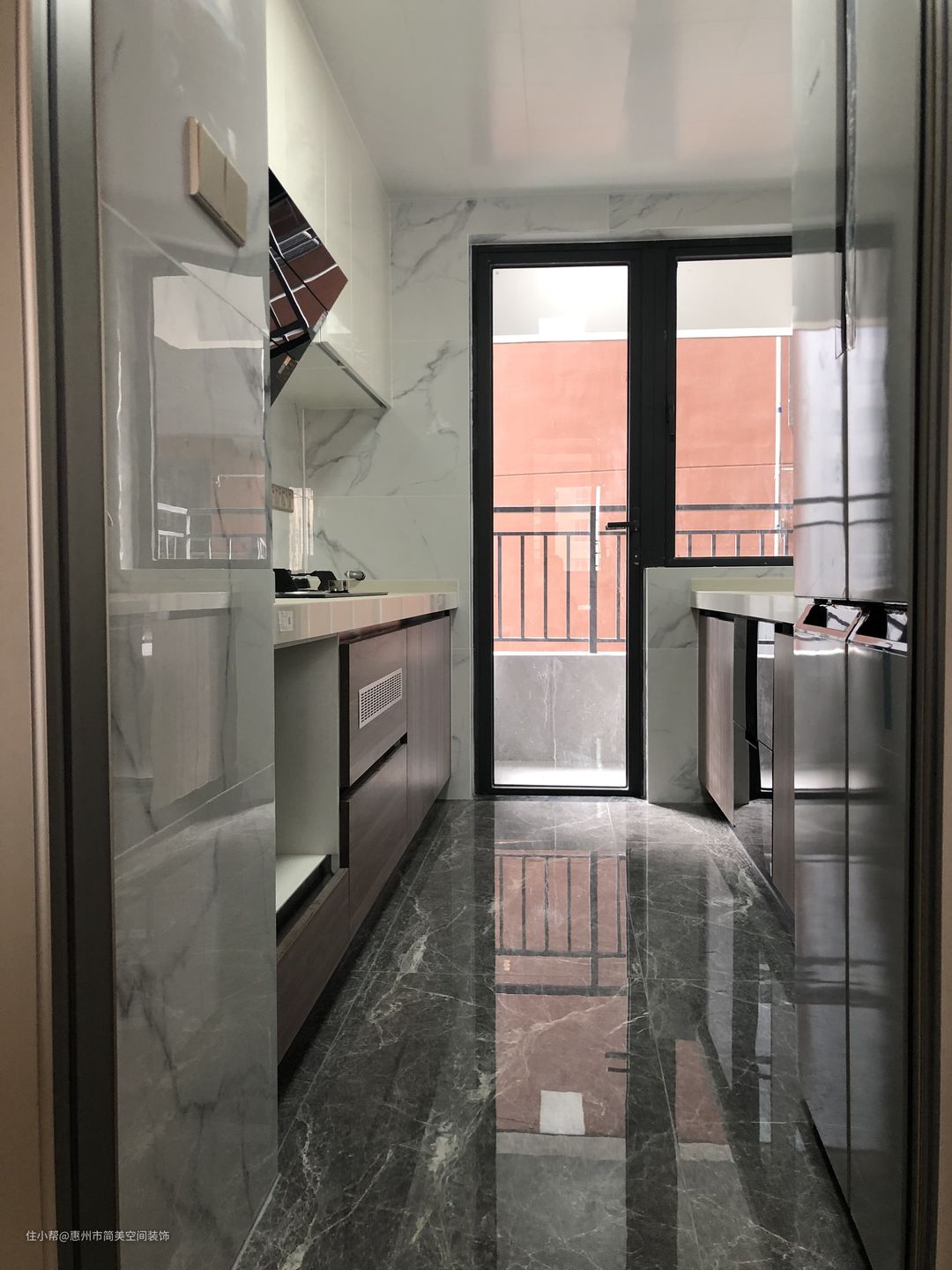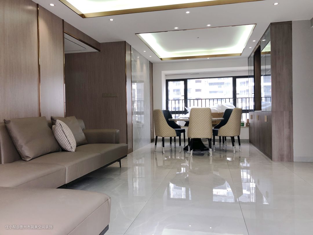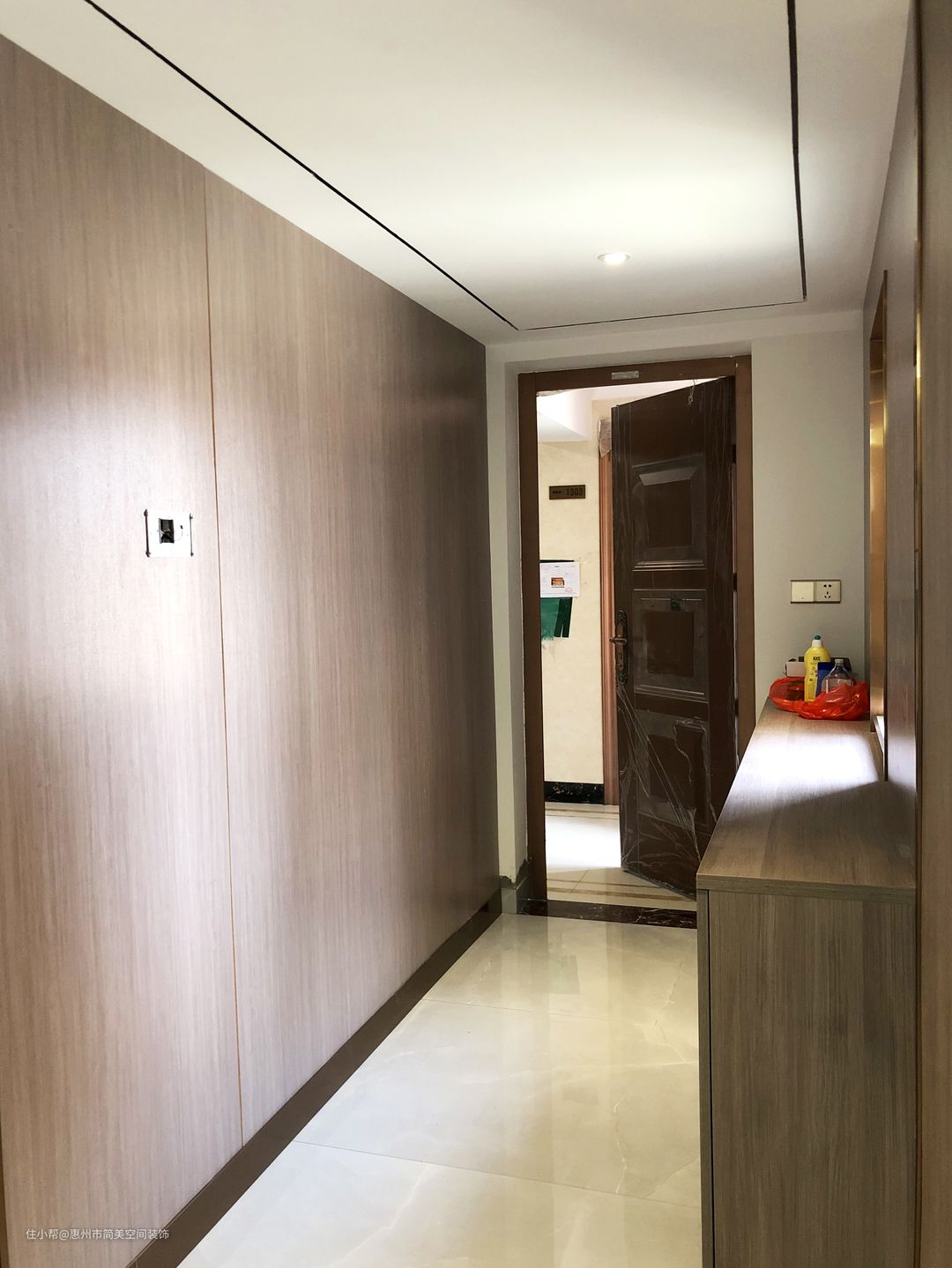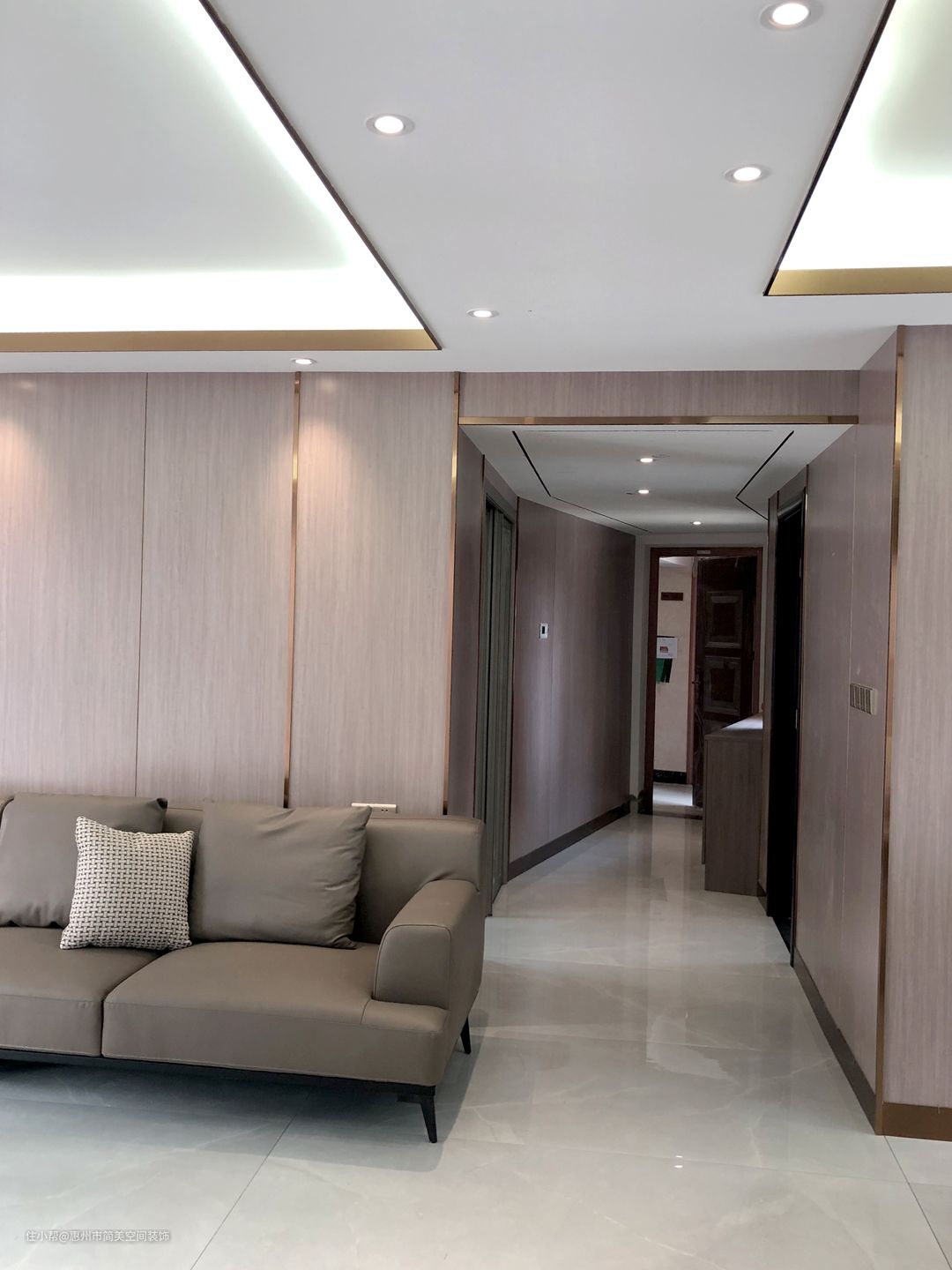 业主需求是简洁,大气的现代风格,家里有老人,一个男孩,一个女孩。希望整体氛围能温馨点。又不希望过于复杂。业主喜欢金属线条的奢华感,又担心金属条过于多了的话,老人可能不太适应。所以在入户区域用了大色块的暖灰色的木质护墙板提升家居的温馨感。在电视背景的处理上用爵士白大理石上的纹理和护墙板的平静形成互补,白色颜色和整体灰色调形成对比,突出背景。提升整个空间的亮点。过道采用灰色硅藻泥的肌理质感来提升材质对比。增加家居温馨感。