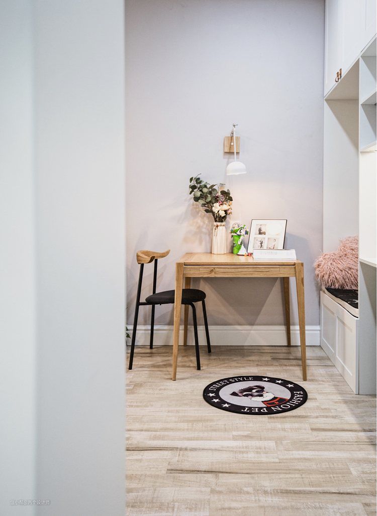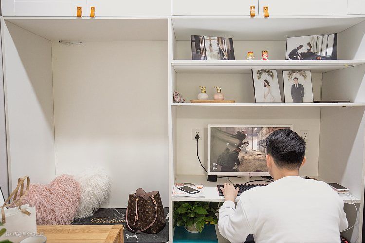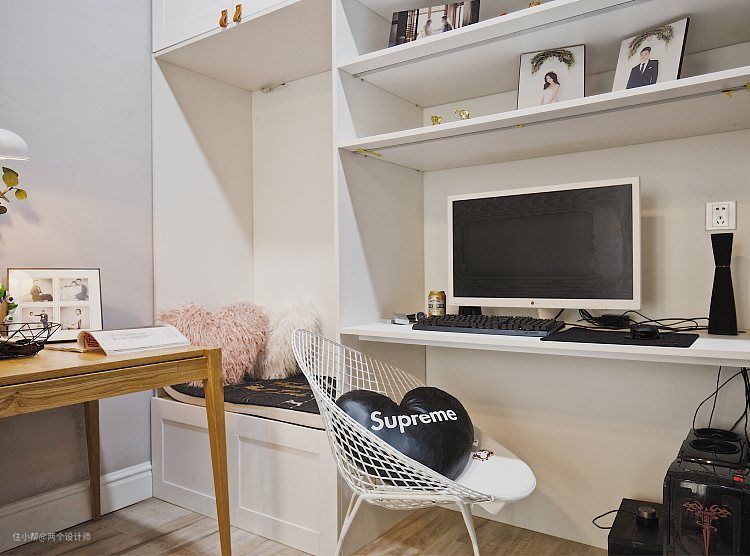 在餐桌旁边,也就是客厅巩形门洞后面,我设计了一整面的柜子。柜体也进行了一些功能分区,餐桌后面是卡座,卡座后面有感应灯,上下也有整面柜体,实用➕储物两不耽误。卡座旁边是男主人的游戏区,因为男孩子喜欢玩游戏,女生呢有时候刷淘宝追剧,但是这俩人又很甜想在同一空间又彼此不干预的进行各自的休闲娱乐,所以就想到了这么一个办法。卡座既是女主人可以窝在上面追剧的小角落,也是吃饭的好地方,就相当于是女生区啦~旁边的电脑桌就是男生区,哈哈,在电脑桌旁边还有一个空挡,我把冰箱安排在了这里。冰箱的位置是距离客厅,餐厅和厨房都很近的一个位置,而且玩游戏玩累了,随手就可以喝一杯冷饮,这小生活想想都爽。