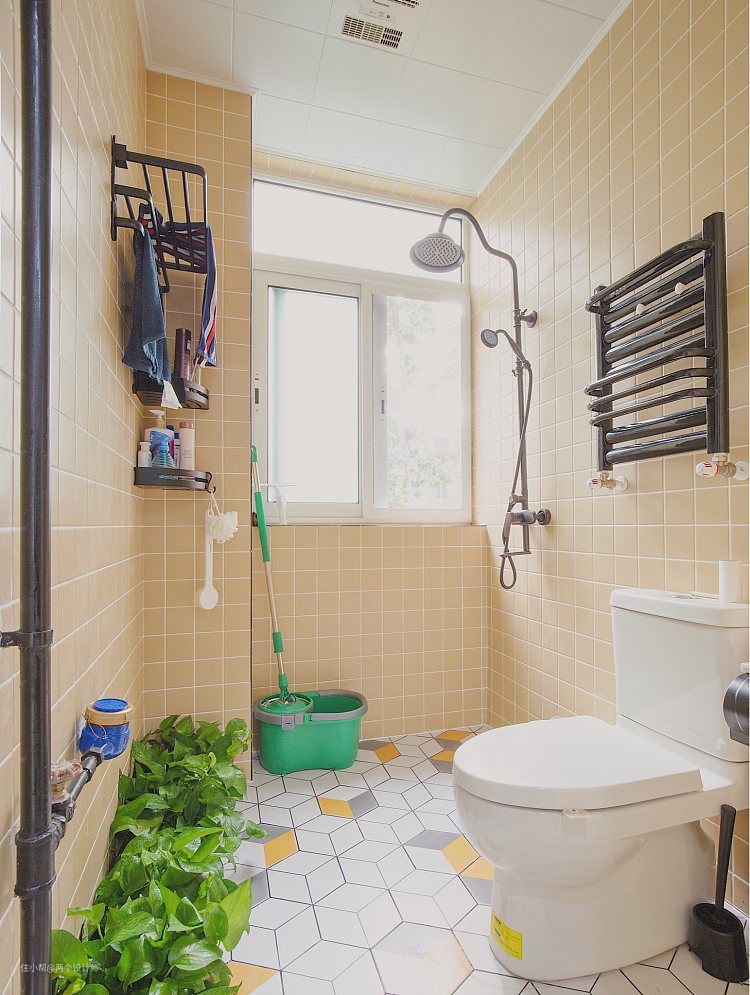 卫生间湿区则是用了10×10的黄色小方砖铺贴,里面所有的配件除了马桶,全部采用了黑色质感。依然贴合整个空间风格。怎么样,有没有被我的一些小细节打动。能说的简直太多啦,我都想不过来