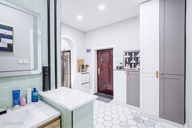 之前他们家里的玄关和餐厅是共处于同一个空间的,玄幻被各种柜子包围再加上有一个餐厅,就显得空间尤其的小。改后的户型完全把玄关解放出来,做了开放式的厨房,半开放式卫生间(干湿分区),把餐桌挪到了客厅的位置,使得一进门的空间一下子变得宽敞。而且因为玄幻处贯通厨房和卫生间干区,所以这三个部分的地面我们采用了同一种类型的砖,六角小花砖进行铺贴。