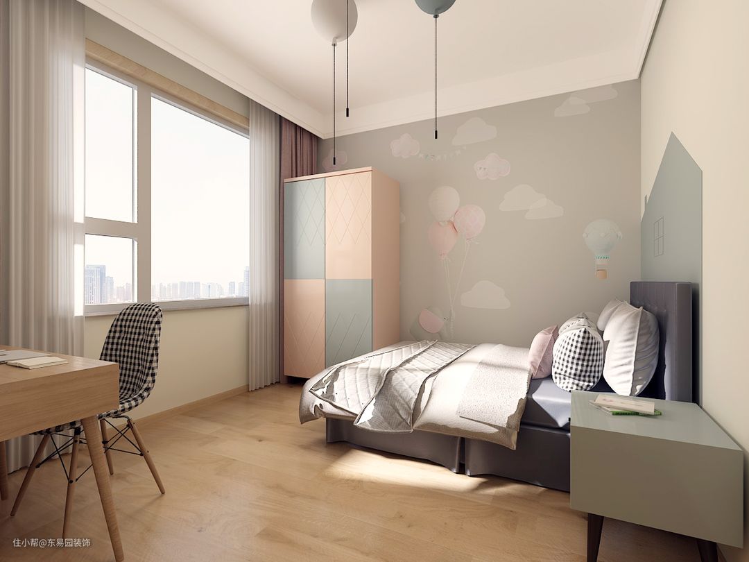 儿童房整体墙面的儿童壁纸,粉色和灰蓝色的柜体,气球灯装饰,让空间温暖舒适,更加童真。