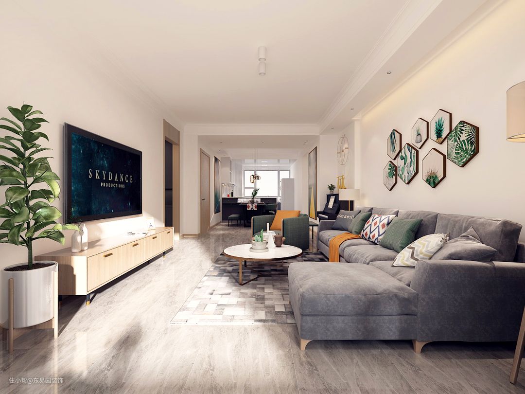 客厅空间整体采用了灰色地砖,原木色柜体,再配有灰色系,墨绿色沙发布艺,让整个家不再单调,落地灯和沙发背景墙的洗墙灯带,营造整个空间的氛围。
