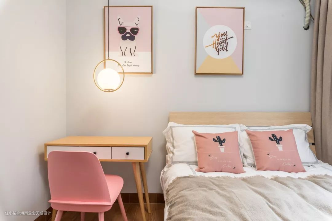 次卧一保留了原来的床,以蓝色为主,灰蓝的墙面,深蓝色布艺装饰,带有粉色花艺的装饰画,让空间更温馨,也呼应了整体设计的色彩定位。