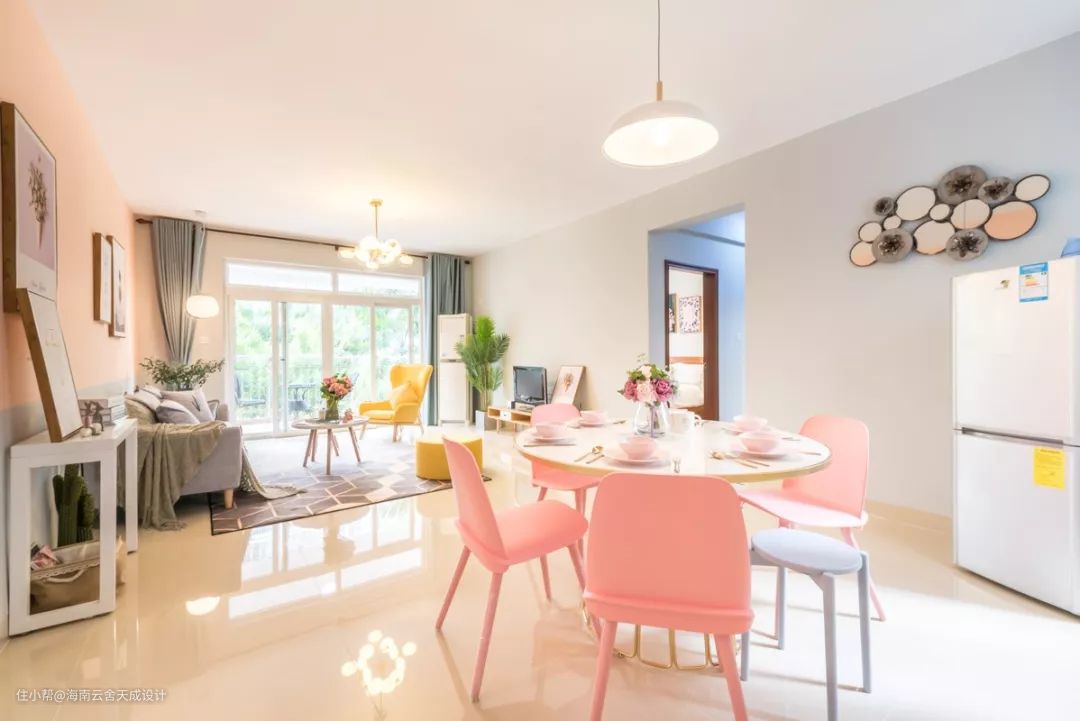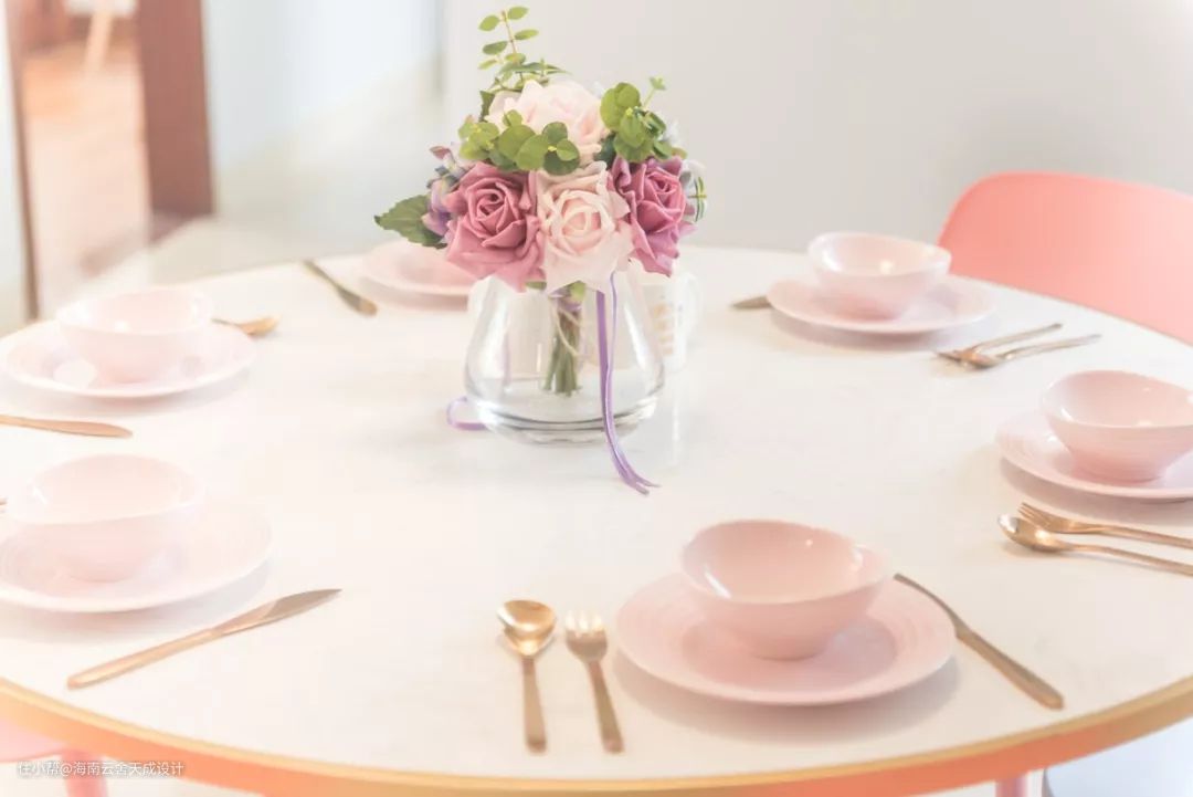 餐厅以粉色为主,洁白的餐桌,配上粉色的餐具与花艺,让吃饭变成一种美好的过程。