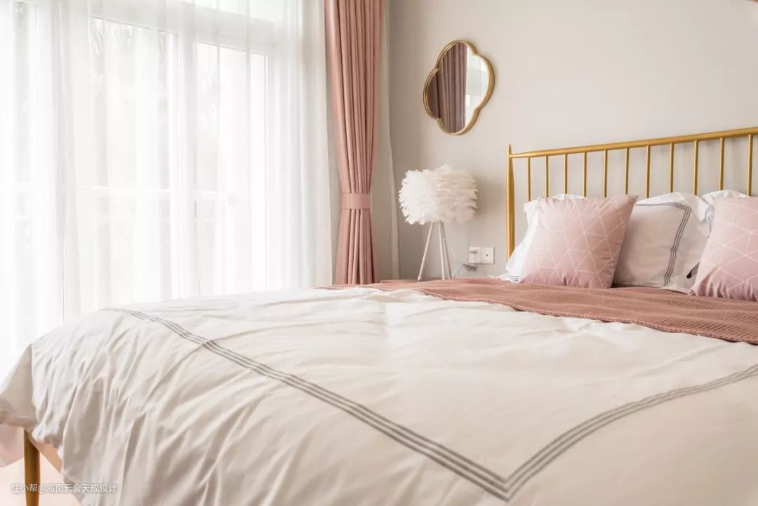主卧空间整体是灰蓝色调,装饰粉色布艺,空间变得温馨、灵动。