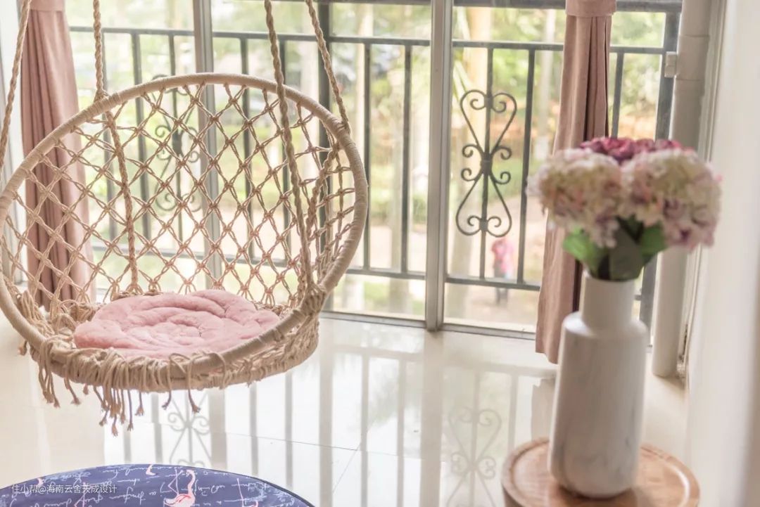 灰蓝色的墙面,温暖的木质家具,粉色的布艺坐凳,入户打造的是一个安静、休闲、放松的空间,频繁的出差,让人身心疲惫,在这个空间可以看书、赏花,只做自己喜欢的事情,或什么也不做,只靠坐在吊椅上,完全放空自己。
