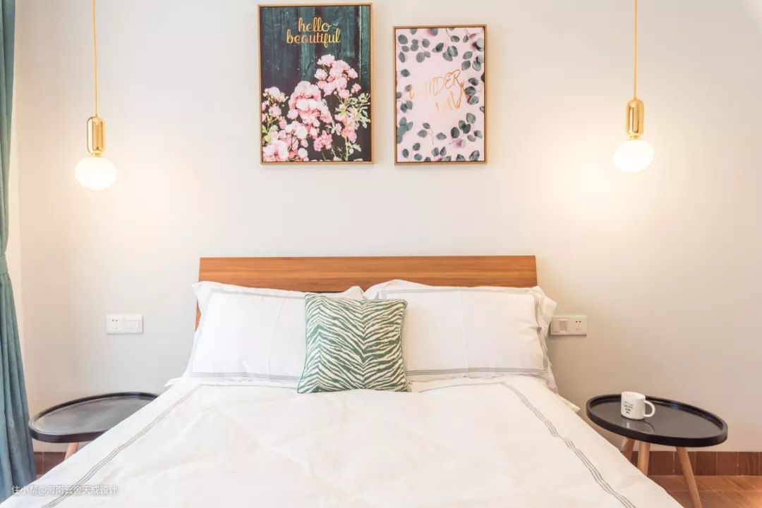 次卧一保留了原来的床,以蓝色为主,灰蓝的墙面,深蓝色布艺装饰,带有粉色花艺的装饰画,让空间更温馨,也呼应了整体设计的色彩定位。