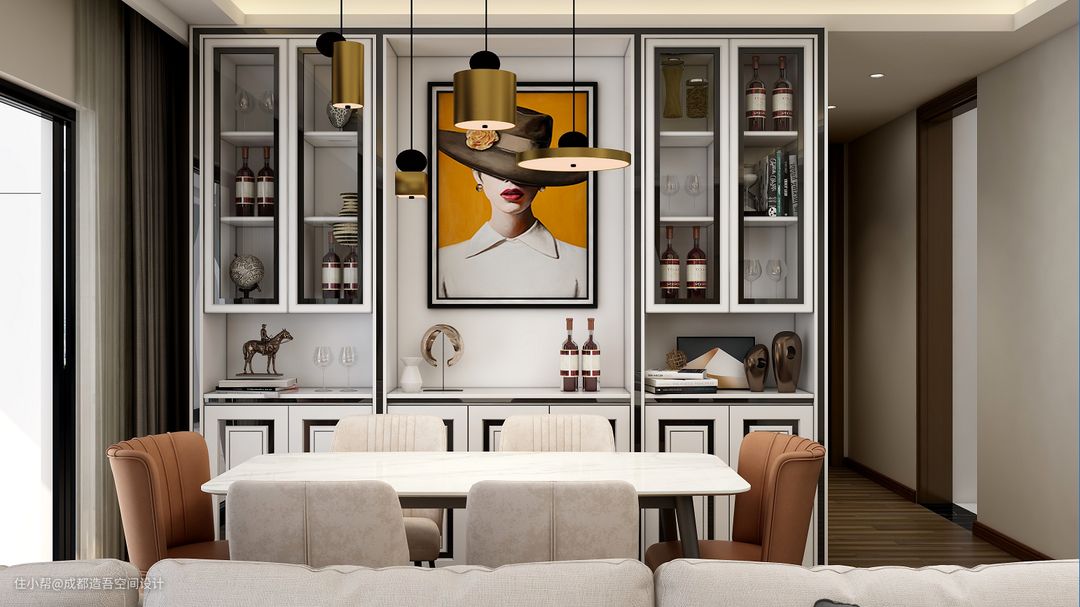 餐厅区域延续客厅的现代混搭风格,大理石质感餐桌搭配黑白线条餐边柜,点缀黄铜吊灯,不过橘色的餐椅和装饰画为餐厅带来一抹亮色,塑造更适合用餐的活泼氛围。