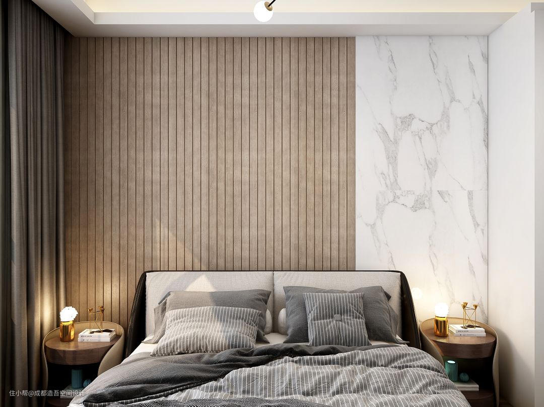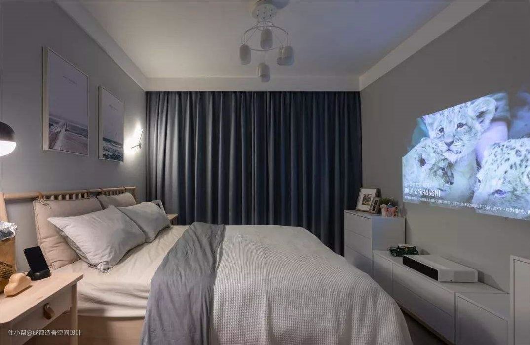 设计师结合二者需求,最后将家庭影院安排在主卧,合理利用卧室墙面,做到空间不浪费又方便休闲。