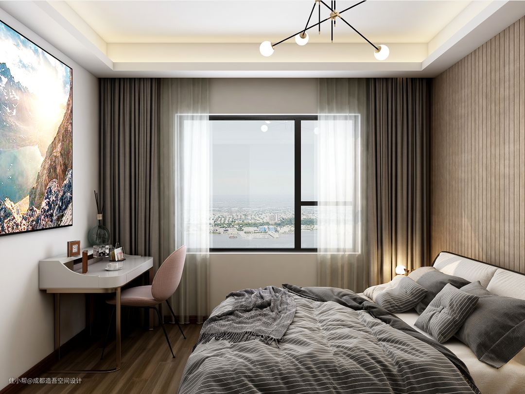 角落放置不遮挡的梳妆台,利用好一分一厘,让并不算大主卧满足休息、休闲、衣物收纳、梳妆等等。
