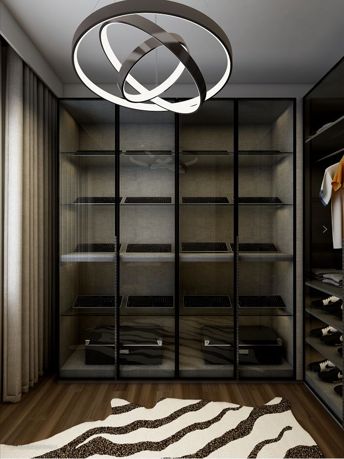 定制打造玻璃收藏柜,柜内设计成多种组合形式,既可以展示收藏的键盘、球衣球鞋,也能用于放置书本和其他杂物,以此延长柜体的使用寿命。