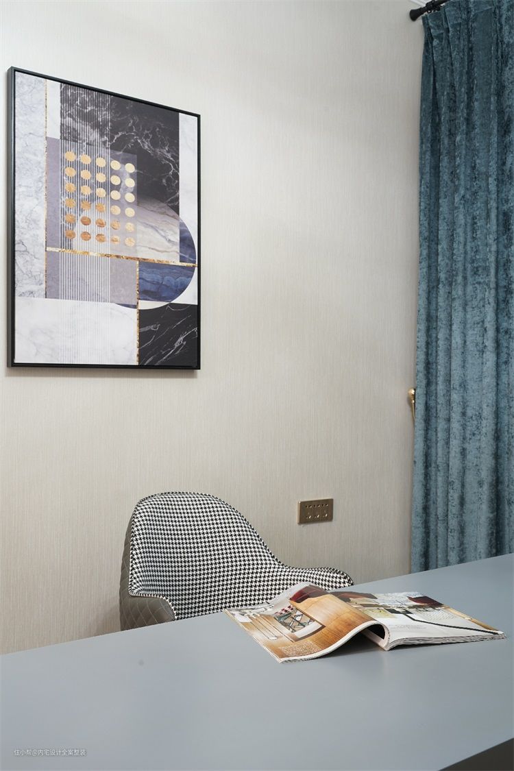 千鸟格座椅,金属质感的书架,丝绒窗帘,既延续了整体的法式轻奢风格,又契合男主人的审美趣味。