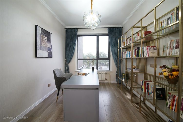千鸟格座椅,金属质感的书架,丝绒窗帘,既延续了整体的法式轻奢风格,又契合男主人的审美趣味。
