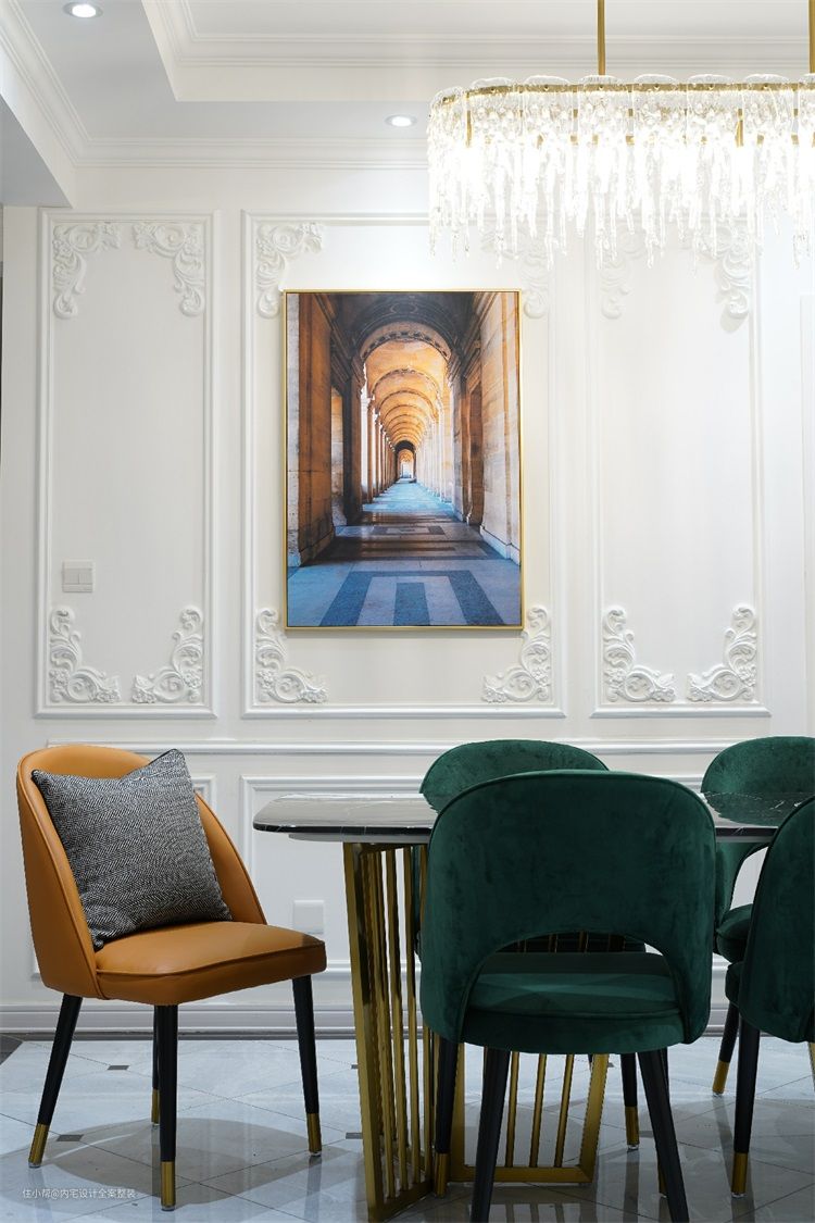 焦糖与墨绿的搭配,既不单调又显高级。金属线条与水晶吊灯,细节中让这里流淌着法式的优雅。