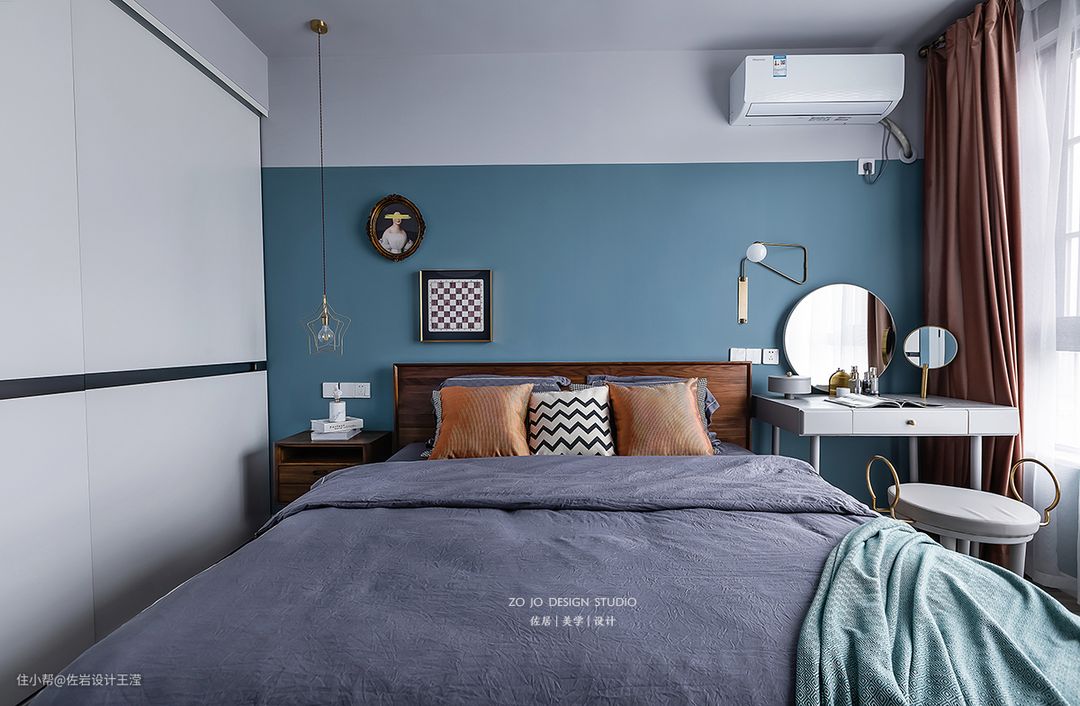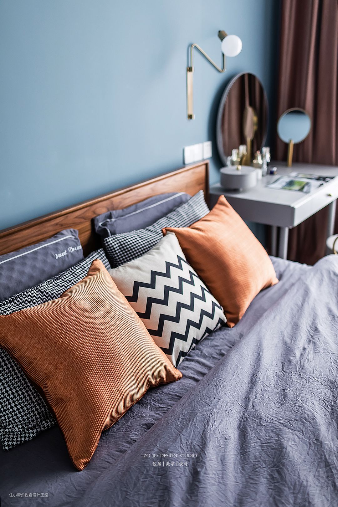 主卧仍然选用了半墙刷漆方式,因为主卧的窗户非常大,采光很棒,所以顶和上半墙均采用了灰色乳胶漆,而主卧的半墙相对于客厅的半墙进行了拔高,刷到了2.2米的高度,因为这种高度更能从视觉上增加层高。 卧室的照明采用了主照明加辅助照明的设计,床头一个吊灯一个壁灯,搭配卧室中央的羽毛灯及窗边的明装筒灯,兼顾了所有方位的照明,而两个床头灯也起到了很好的装饰作用,各个方位的灯光也可以互不打扰,方便一个人入睡另一个人活动时使用照明。