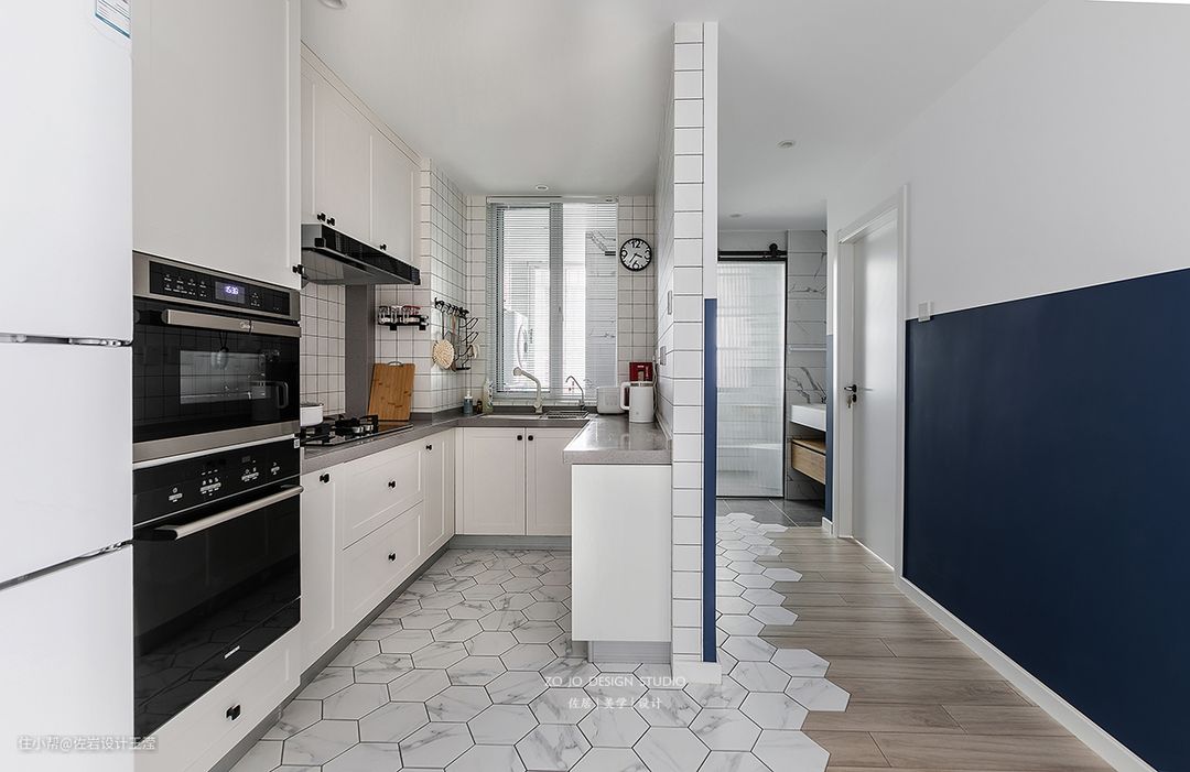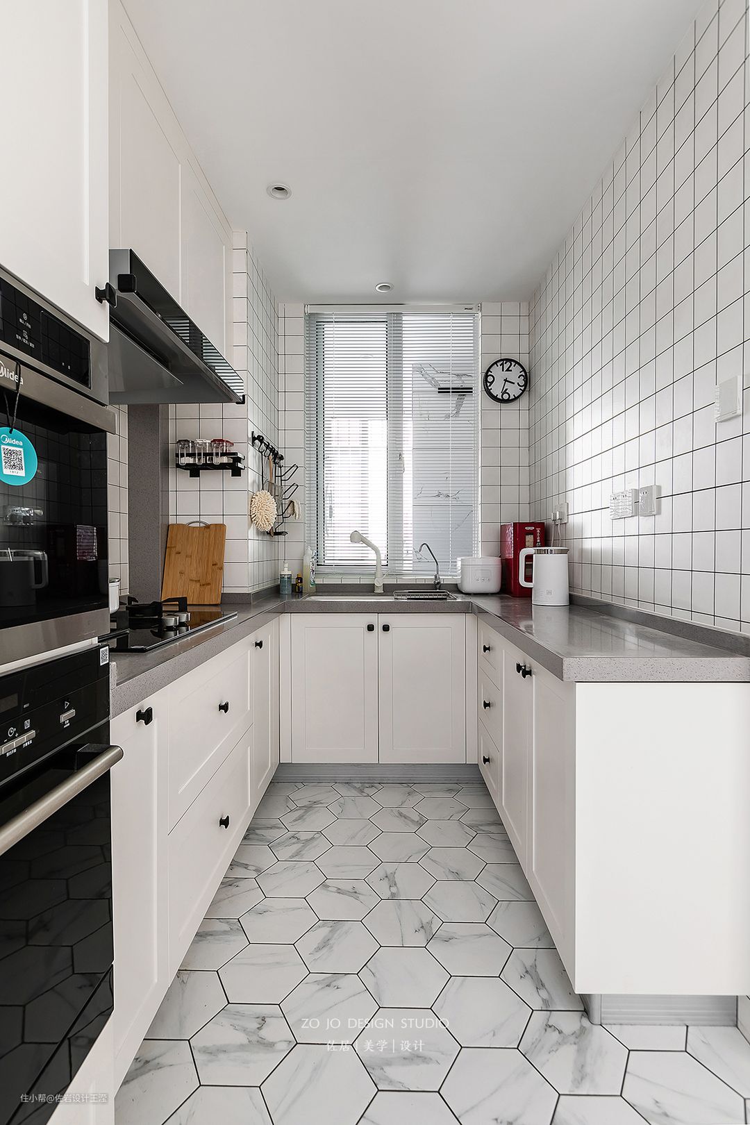 将厨房扩大之后,u型厨房将基本的水池、烟机安置后,还加入了一个高柜,容纳了洗碗机、蒸烤箱。备餐区也大大延长,而另一侧可作为小家电的摆放区,电饭煲、烧水壶、榨汁机等都有充足的地方摆放。值得一提的是厨房一侧的橱柜并没有做满,因为目前的柜体在今后的使用过程中完全够用了,后面可以增加移动的收纳如手推车进来,放一些不适合放入冰箱的蔬菜水果等,使用起来更加灵活。水池区域为新搭建的墙体,水池上面开了到顶的窗户,最大限度的保证采光。 厨房目前为开放式的设计,因为现在客户的小孩非常小,希望家中尽可能有大的活动空间,如果今后有需要,加入一段玻璃隔墙和推拉门就好了,十分方便。