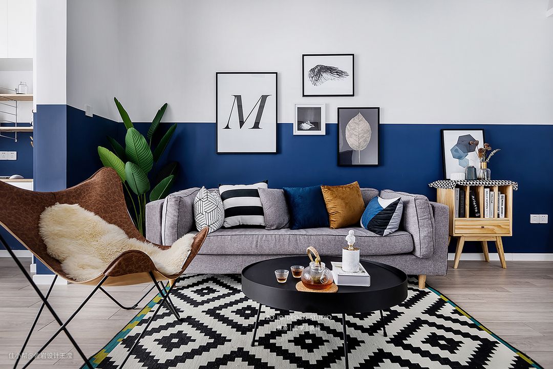沙发背景墙的正面照,沙发,茶几,地毯,挂画,都选用了饱和度较低的灰色系,完全没有抢蓝色半墙的风头,单人椅,边柜,抱枕及软装很好为棕色系,降低了整个空间的冷色调。家中只能有一种东西可以完全跳脱色系的设计,那就是绿植!绿植的加入,更加有家的感觉。值得一提的是这块宜家的地毯,地毯是客户几年前就购入的,使用的很爱惜,于是又带到了新家,搭配起来毫无违和感。