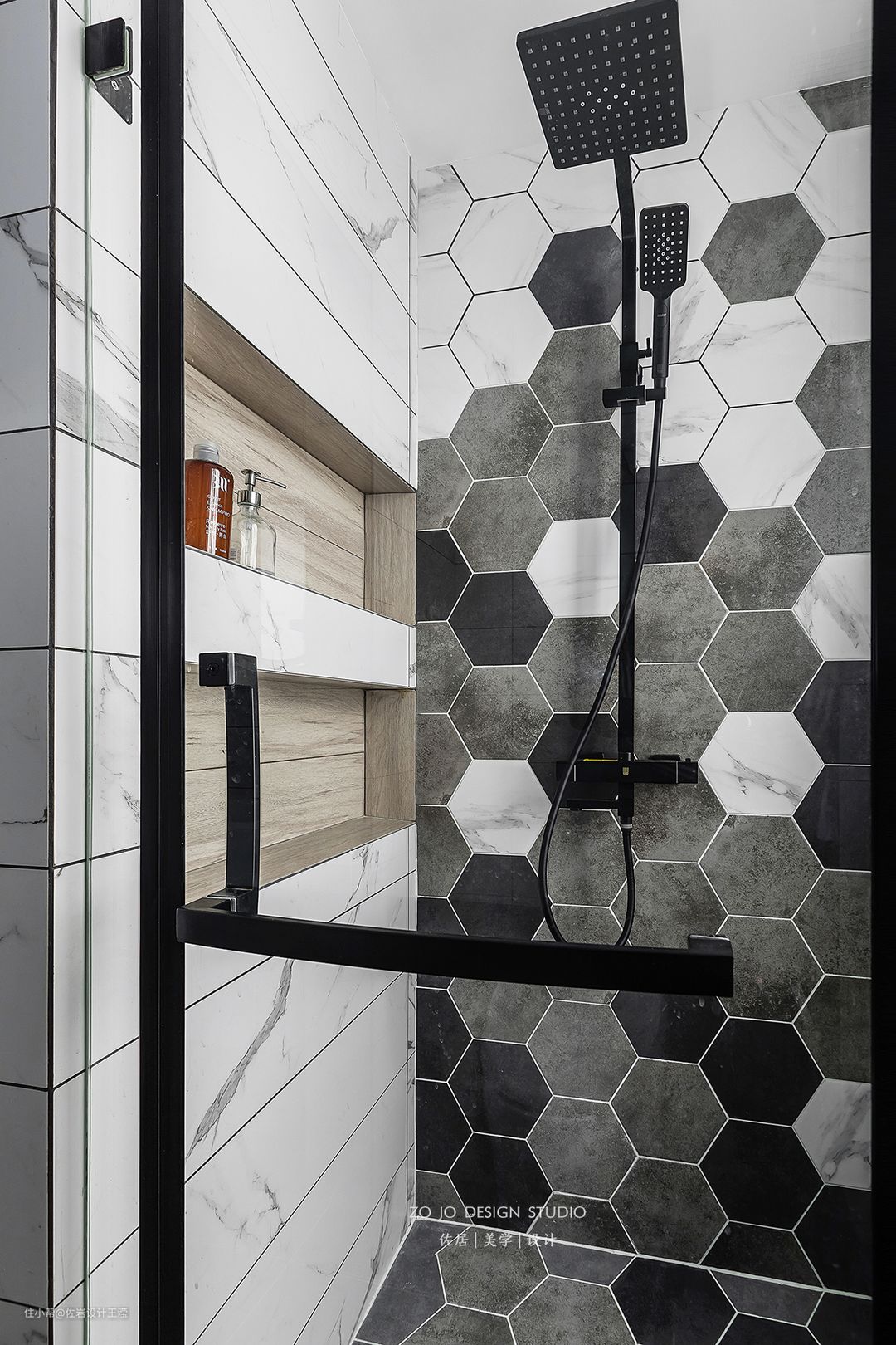 淋浴区 通过户型的改造,将卫生间向生活阳台挪动了一部分,大大增加了原有湿区的空间,可以很轻松的做一个淋浴房出来,淋浴房同样选用了一面六角砖,而颜色加深了许多,配上黑色磨砂的花洒及淋浴房,使得整个空间沉稳许多,因为是新建墙体,所以做了一个壁龛出来,壁龛的位置铺的是木纹砖,原木色很好的中和了黑色系的其他区域,壁龛的好处就不用多说了,除了拿取方便,不易碰撞,在视觉上也更加清爽。