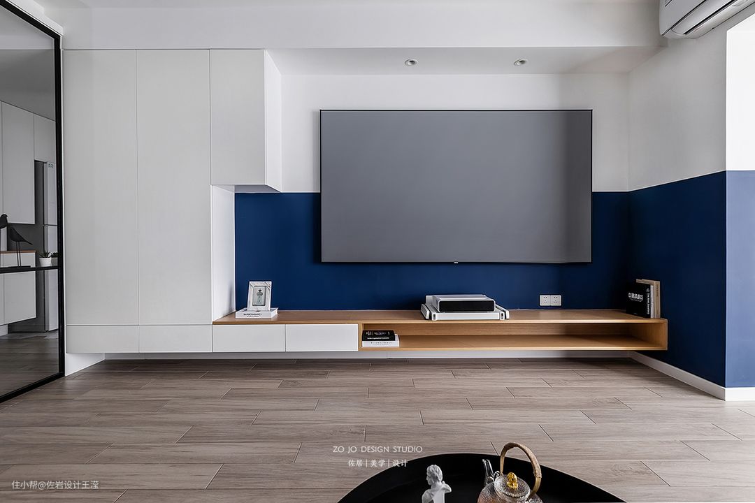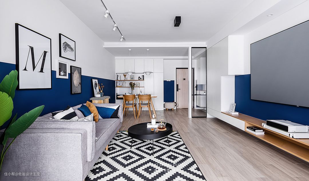 装饰画从阳台方向看整个空间,可以看到完整的客厅,餐厅,玄关。 客厅使用的无主灯照明,因为不想占用层高,所以选择了明装筒灯搭配轨道灯。整个客餐厅区域采用的半墙刷漆方式,颜色选用了午夜蓝,颜色较深,显得十分厚重沉郁,做半墙特别适合,因为大面积涂刷不免显得空间暗淡,但是换做半墙就会将暗淡的感觉大大降低。 使用蓝色作为墙漆要注意其他色彩的搭配,在蓝色以外只能出现一个色系,此次装修我们除了蓝色,便是加入了黑白灰等饱和度较低的色系,以及较少的原木色来搭配,保证了蓝色的主体视觉位置,空间不会杂乱。