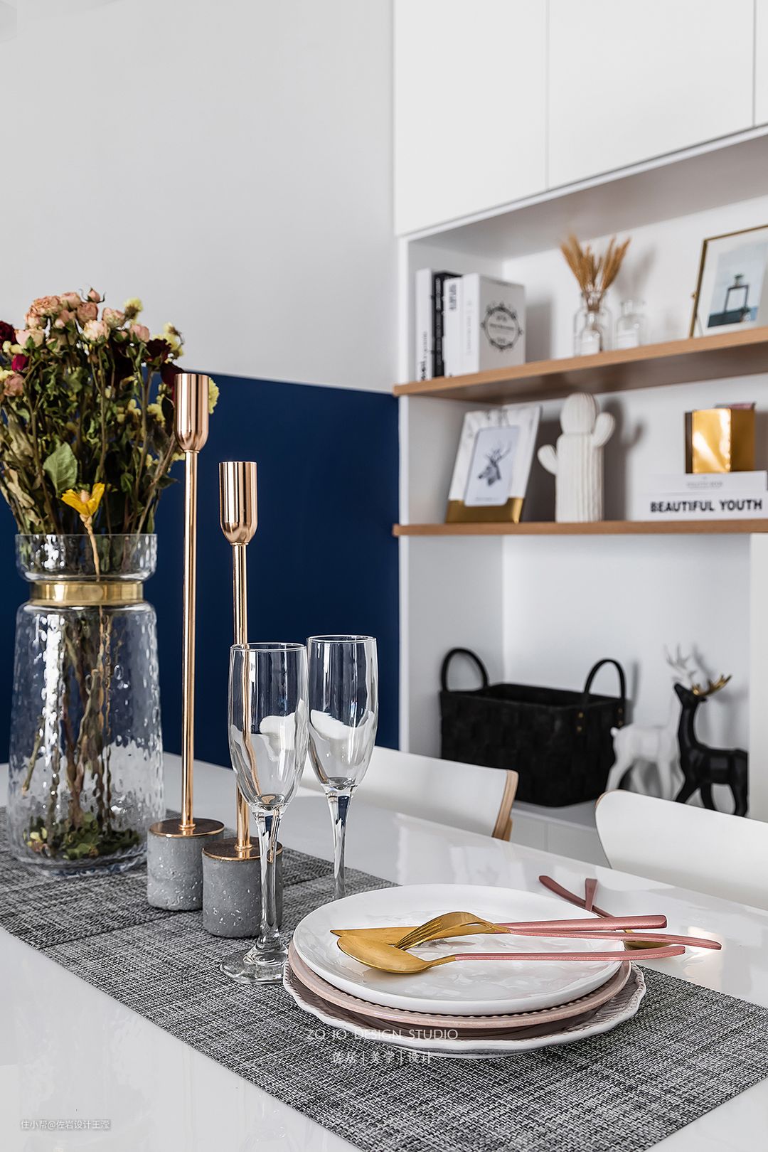 进门左手边是客厅区域,沿墙做了个餐边柜,尽可能的扩大家中的收纳空间,柜门是白色,降低了餐边柜的存在感。餐厅的摆件装饰品也是经过精挑细选,摆场出来的效果