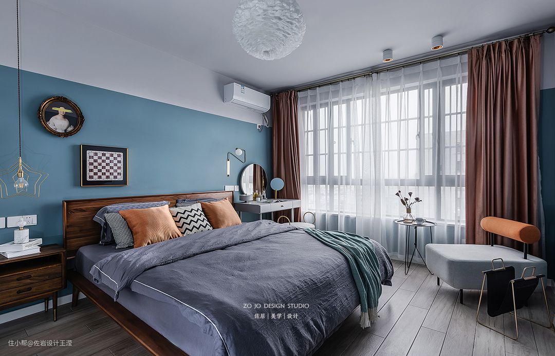 主卧仍然选用了半墙刷漆方式,因为主卧的窗户非常大,采光很棒,所以顶和上半墙均采用了灰色乳胶漆,而主卧的半墙相对于客厅的半墙进行了拔高,刷到了2.2米的高度,因为这种高度更能从视觉上增加层高。 卧室的照明采用了主照明加辅助照明的设计,床头一个吊灯一个壁灯,搭配卧室中央的羽毛灯及窗边的明装筒灯,兼顾了所有方位的照明,而两个床头灯也起到了很好的装饰作用,各个方位的灯光也可以互不打扰,方便一个人入睡另一个人活动时使用照明。