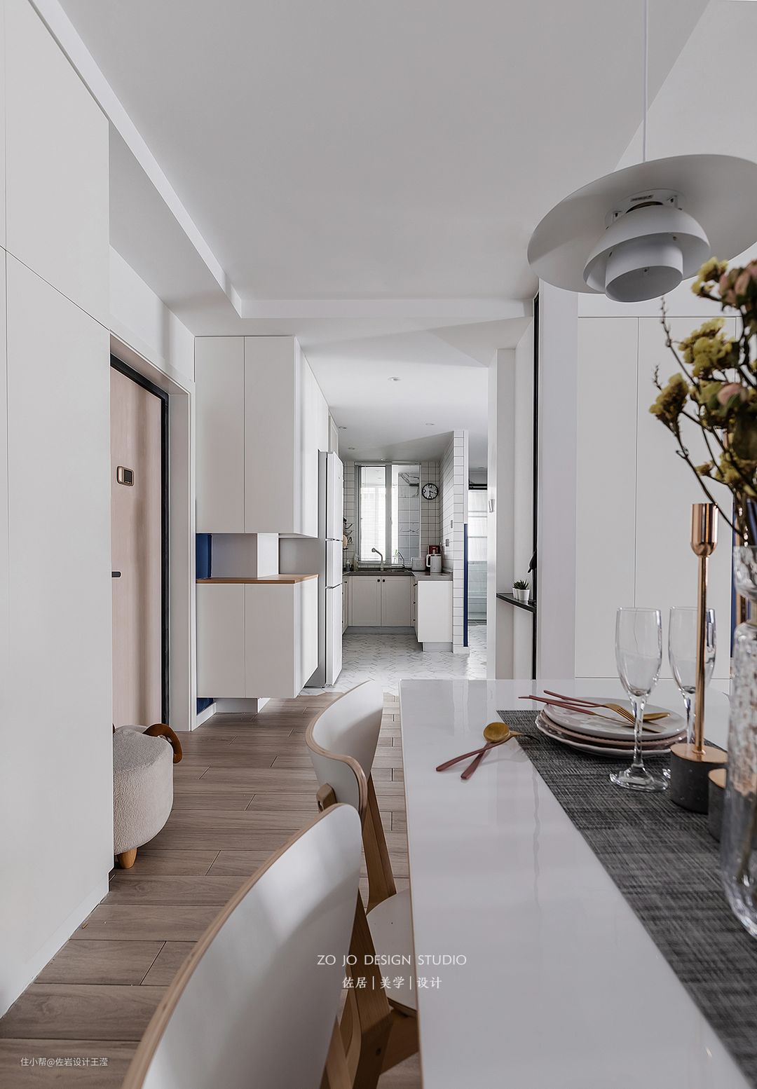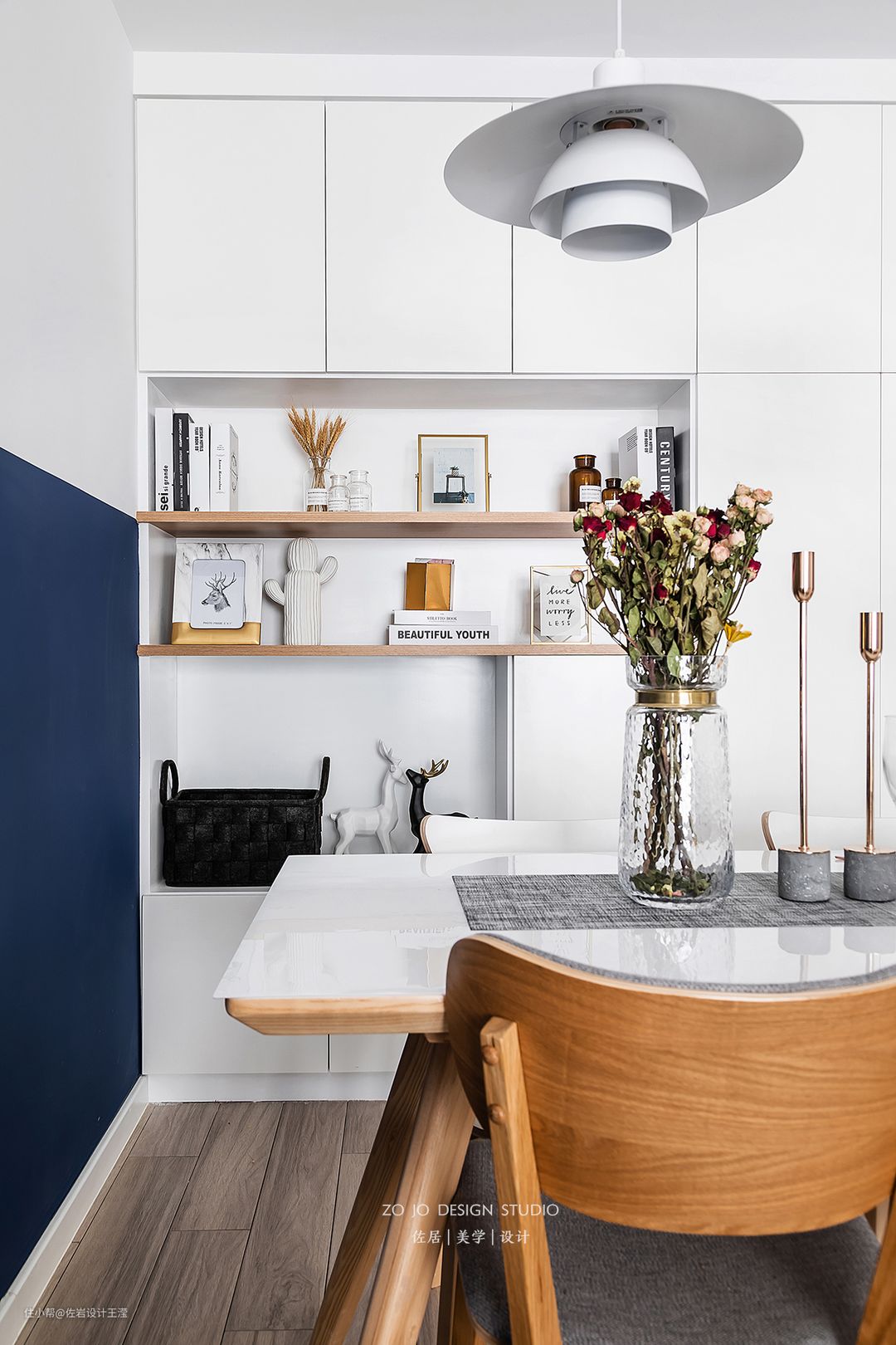 进门左手边是客厅区域,沿墙做了个餐边柜,尽可能的扩大家中的收纳空间,柜门是白色,降低了餐边柜的存在感。餐厅的摆件装饰品也是经过精挑细选,摆场出来的效果
