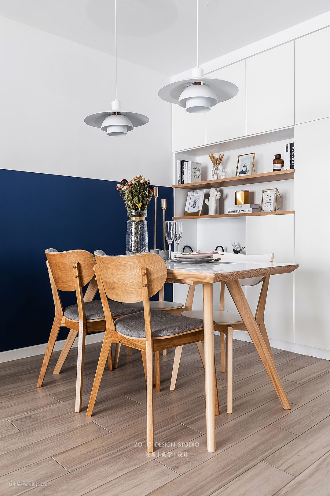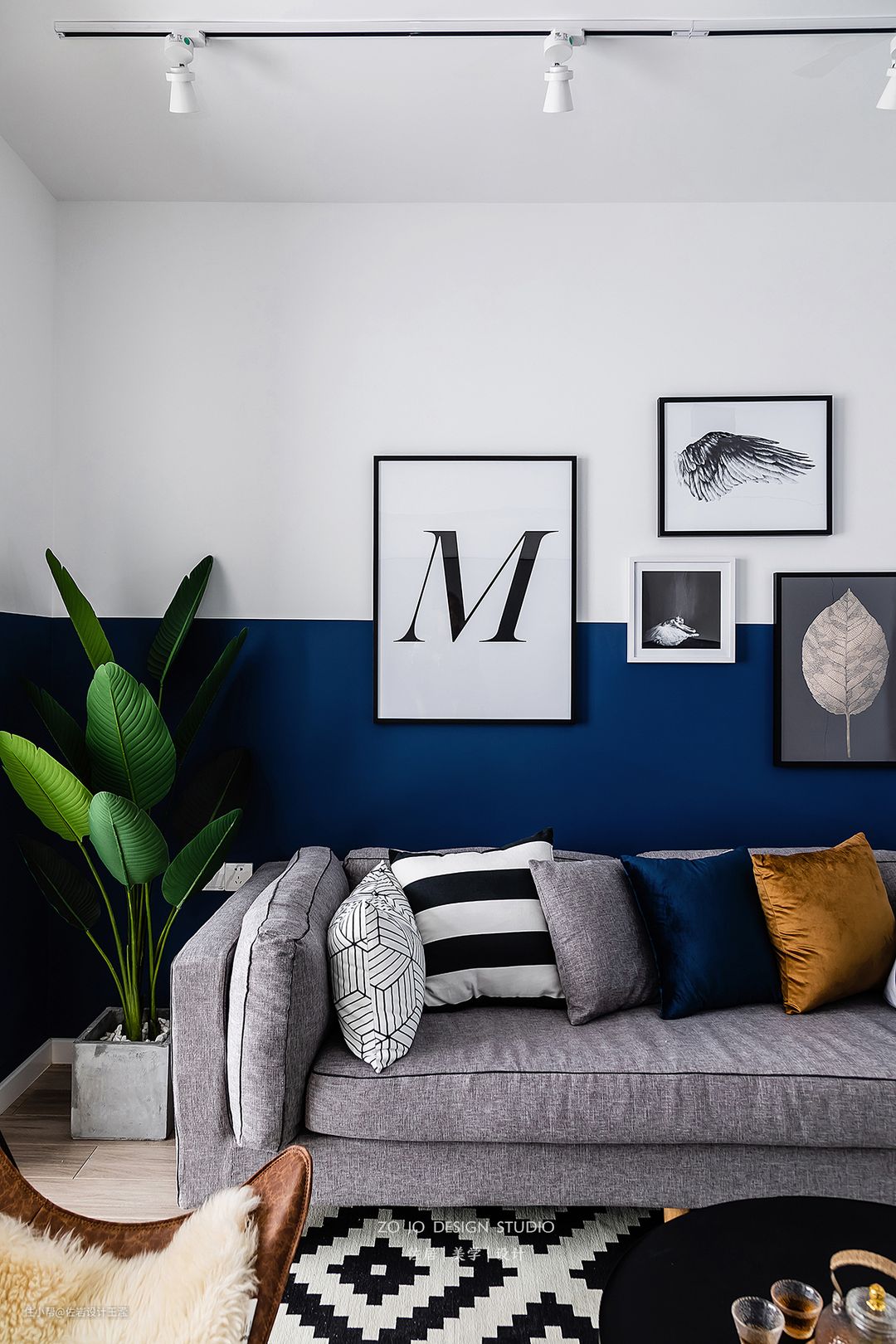 装饰画从阳台方向看整个空间,可以看到完整的客厅,餐厅,玄关。 客厅使用的无主灯照明,因为不想占用层高,所以选择了明装筒灯搭配轨道灯。整个客餐厅区域采用的半墙刷漆方式,颜色选用了午夜蓝,颜色较深,显得十分厚重沉郁,做半墙特别适合,因为大面积涂刷不免显得空间暗淡,但是换做半墙就会将暗淡的感觉大大降低。 使用蓝色作为墙漆要注意其他色彩的搭配,在蓝色以外只能出现一个色系,此次装修我们除了蓝色,便是加入了黑白灰等饱和度较低的色系,以及较少的原木色来搭配,保证了蓝色的主体视觉位置,空间不会杂乱。