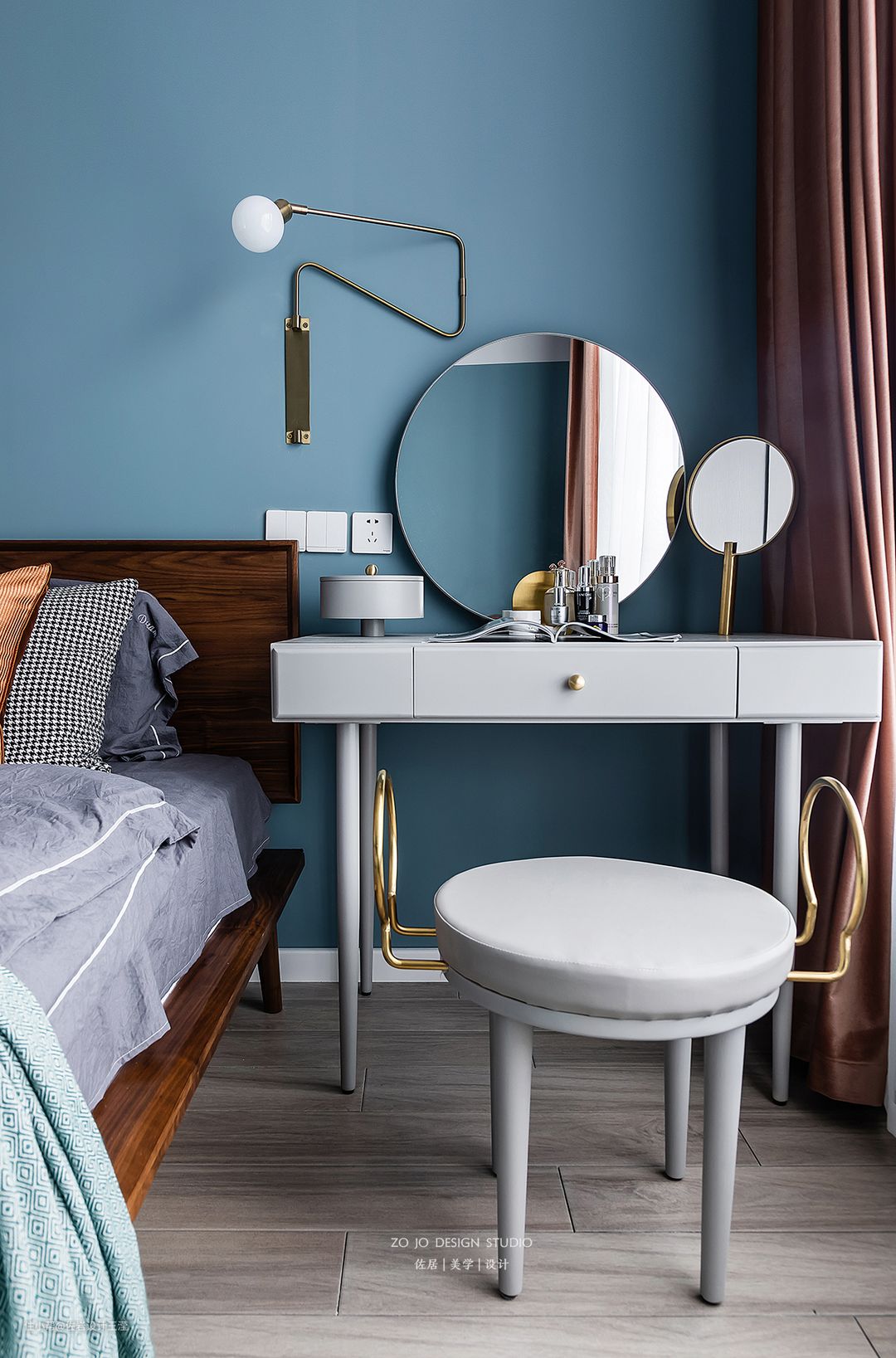 床和床头柜均选用了深色的黑胡桃质地,配上床头背景墙的油画框,增添了一些复古的调调,而白色的衣柜和灰色梳妆台,淡化了一些沉闷。