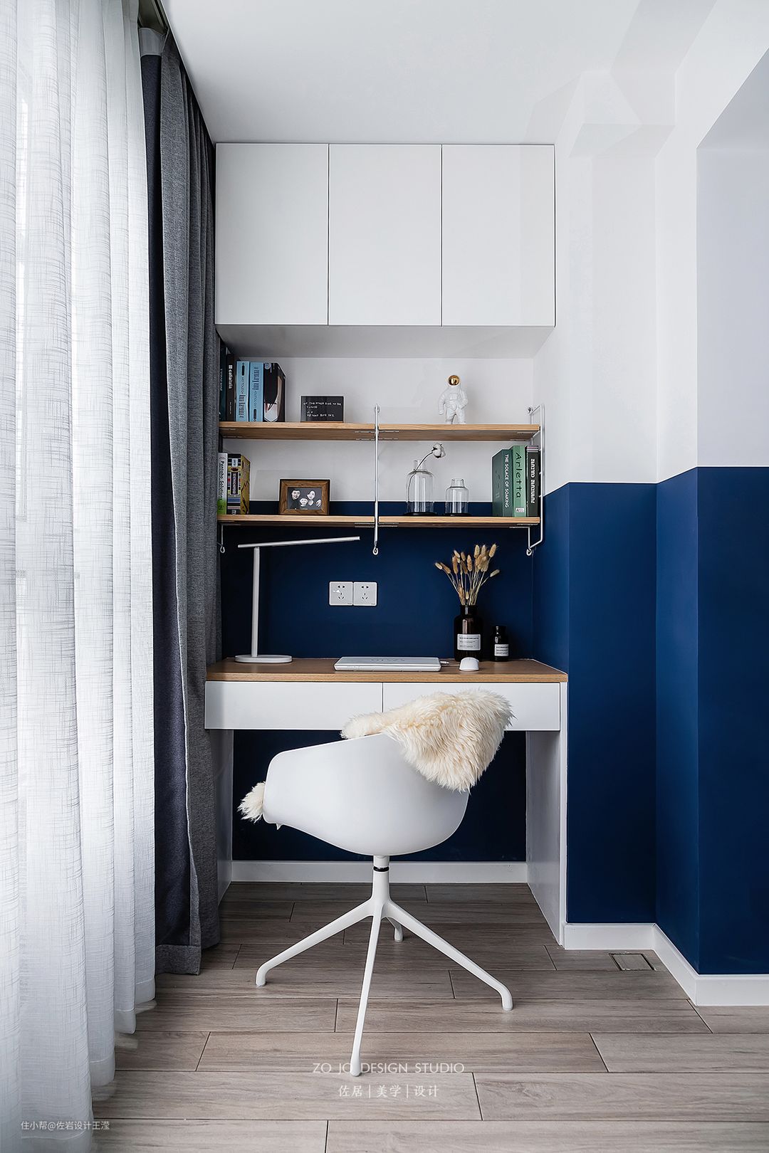景观阳台非常大,当时也是很喜欢这个阳台所以买了这套房,因为是两室的户型,没能设计单独的书房,于是在阳台上设计了一个开放式书房,在定制家具处制作的书桌及书桌上面的收纳柜,收纳架按照阳台尺寸定制后安装。