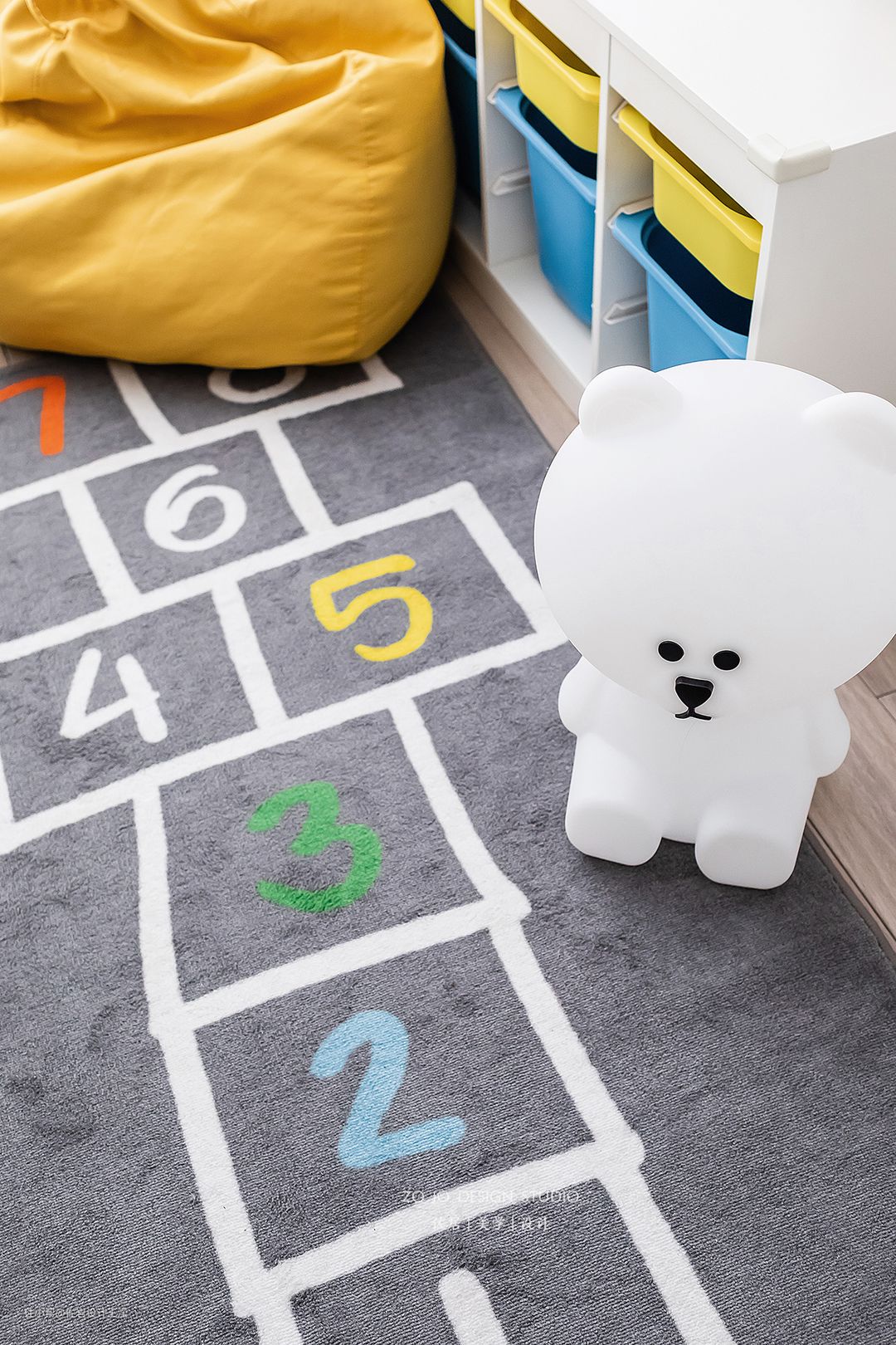 地毯是宜家的HEMMAHOS 汉马豪斯,将小时候常玩的跳房子游戏印制在地毯上,玩具收纳柜是宜家的TROFAST 舒法特系列,筐的颜色有很多种可以自由搭配,有了这些好用的收纳工具,能更好的训练宝宝的收纳能力。