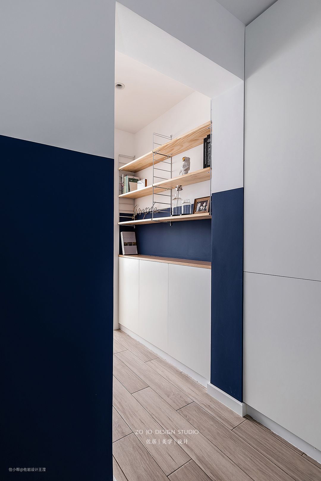 从户型图上可以看到,儿童房的长度非常长,达到了5米,而宽度不足2.8米,作为一个儿童房有些狭长,使用起来不免有些浪费,因为有了宝宝,家里的各种囤货会大大增多,于是划分了一部分作为储藏室,可以完整收纳家中的各个大件,例如电风扇、行李箱、换季衣物、换季床上套件以及各种各样小朋友的囤货。储藏室的对面仍有一部分空间,搁置起来不免浪费,于是就地做了一个薄型的收纳柜,上面搭配展示架,增加了收纳空间的同时,也不显得沉闷。 储藏室是用的宜家的Algot艾格特系列,没有选用常规的木制定制,一方面是出于减少甲醛的原因,因为这个空间没有窗户不易散味,而且又更靠近儿童房,而以金属为主要原材料的艾格特就几乎没有这个问题,另一方便艾格特的拆安都非常灵活,可以更好的提高空间的利用率,提供更灵活自由的收纳方式,这点对于储藏室来说至关重要。有了这个看似不起眼的储藏室,却能极大解决家中的收纳问题,而儿童房的空间也回归了正常的户型,家具摆放起来更加协调。